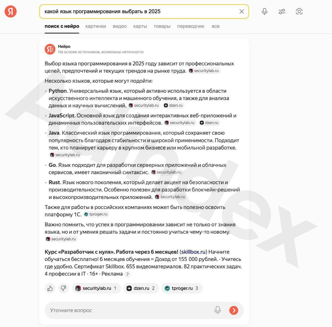 В январе 2025 года Яндекс запустил тестирование рекламы в нейроответах Поиска.