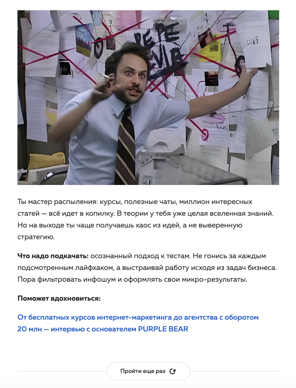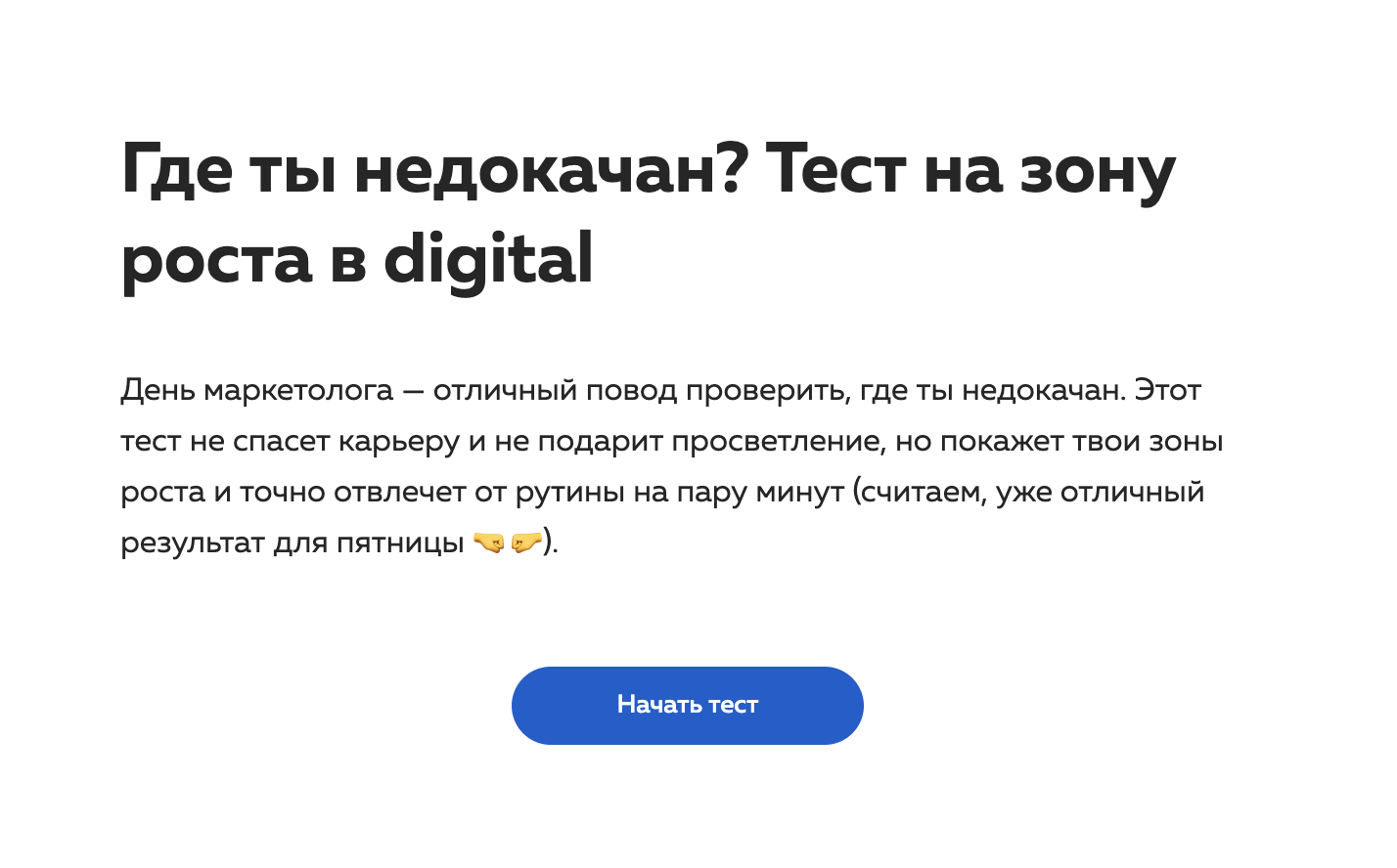 Мы тематический тест делали на День маркетолога, а из результатов вели пользователей на полезные материалы — тем самым повышали время на сайте.