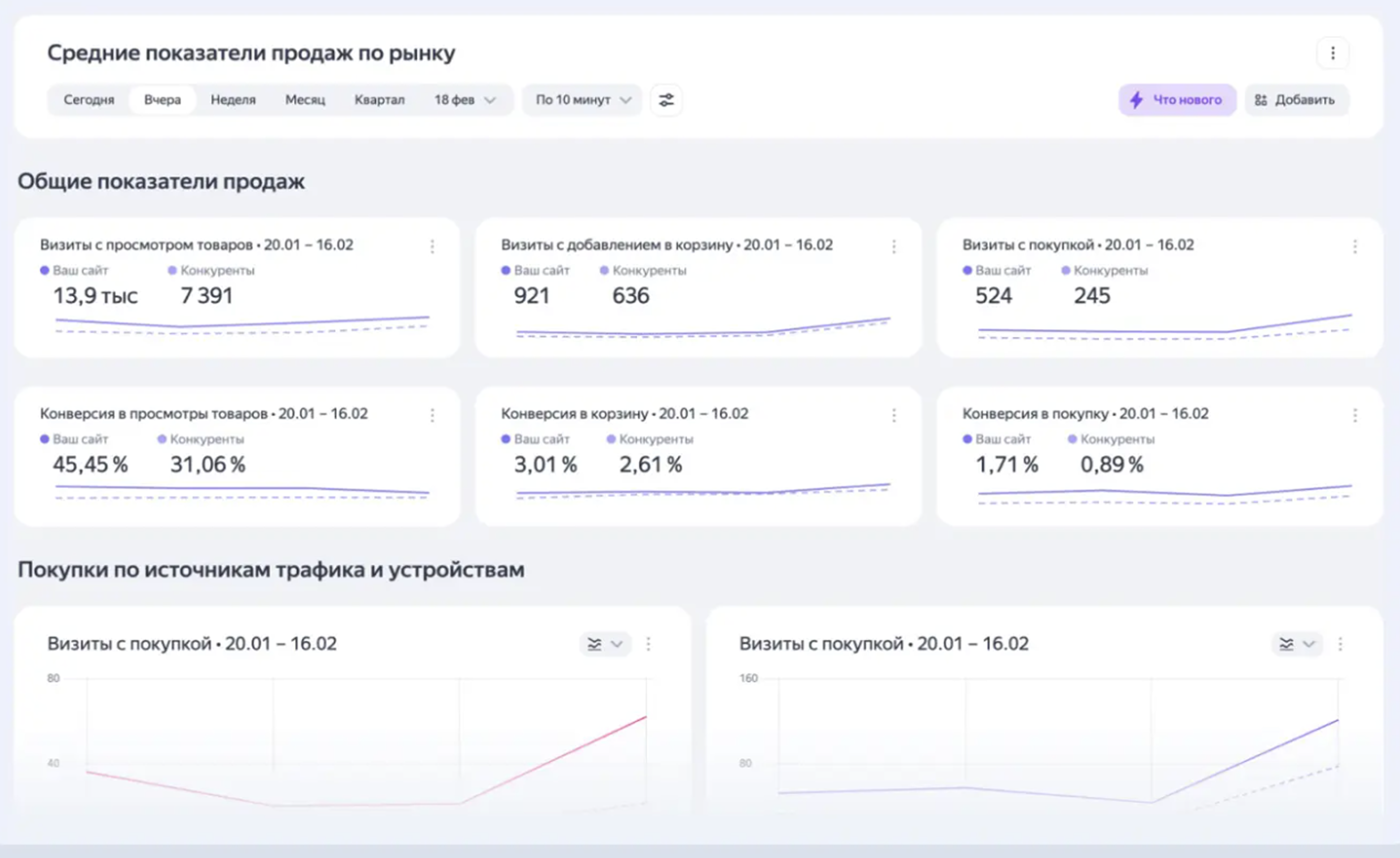 В кабинете Яндекс Метрики появился новый дашборд «Средние показатели продаж по рынку» для экспресс-анализа конкурентов. На нем можно увидеть процент пользователей, которые дошли до просмотра карточки товара, количество тех, кто добавил товар в корзину, и количество совершивших покупку. На основе этих данных можно определить источники трафика, где конверсия в покупку отстает от рынка или опережает его.