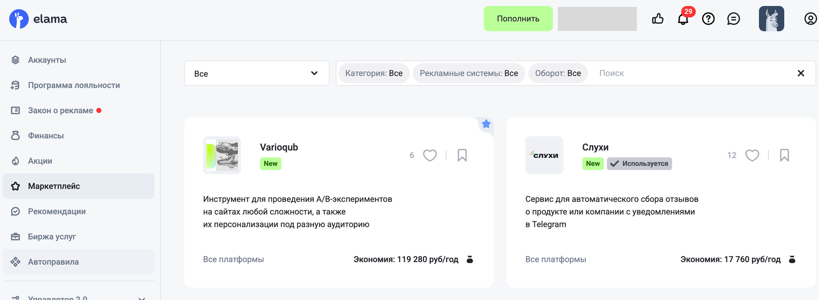 На маркетплейсе eLama появились инструменты Вариокуб и «Слухи»