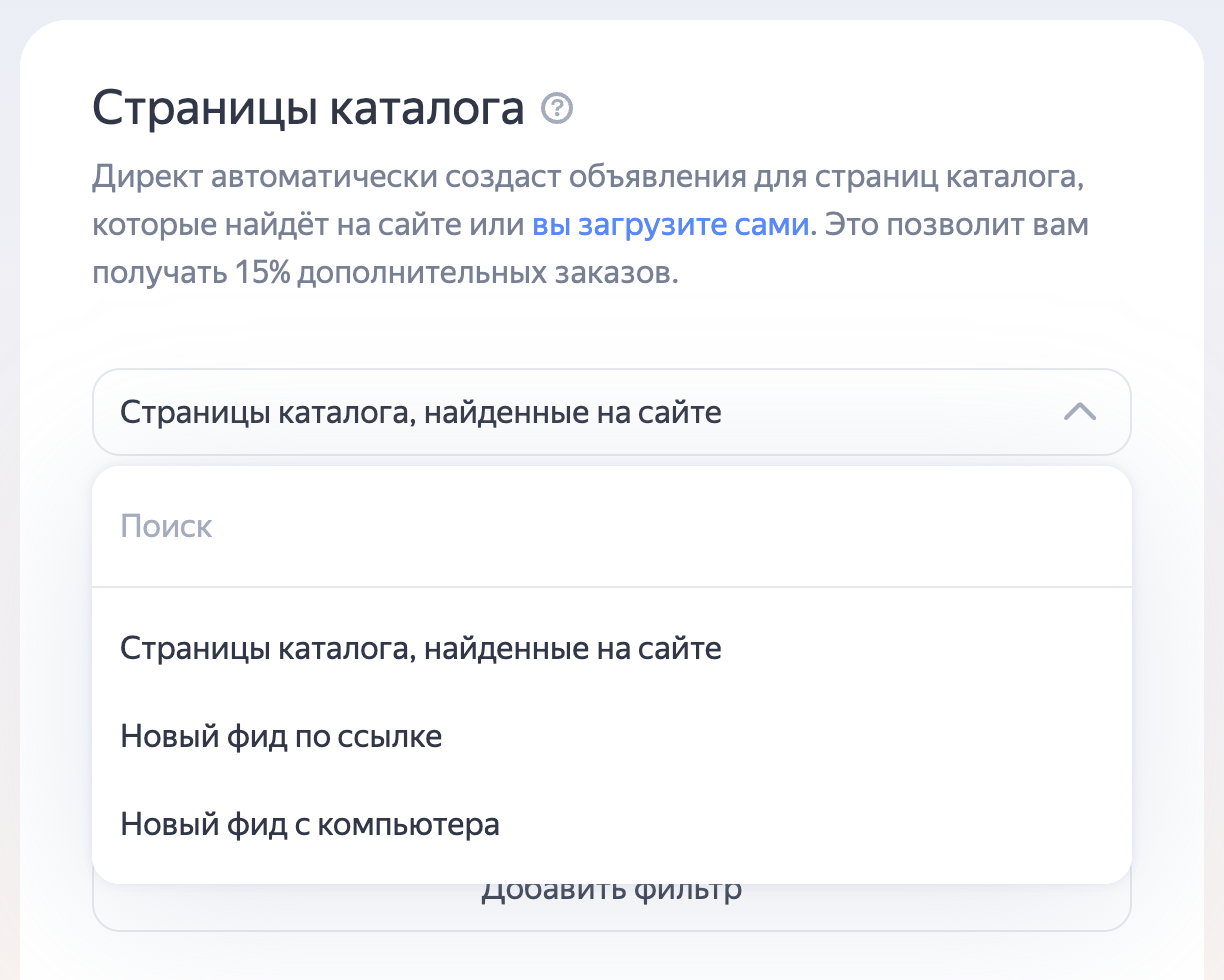Самостоятельно настройте Страницы каталога — иначе Яндекс Директ автоматически создаст объявления для каталогов, товары из которых уже продвигаются в кампании. Чтобы этого избежать, добавьте фид хотя бы с одной страницей. Тогда система не создаст объявление автоматически.