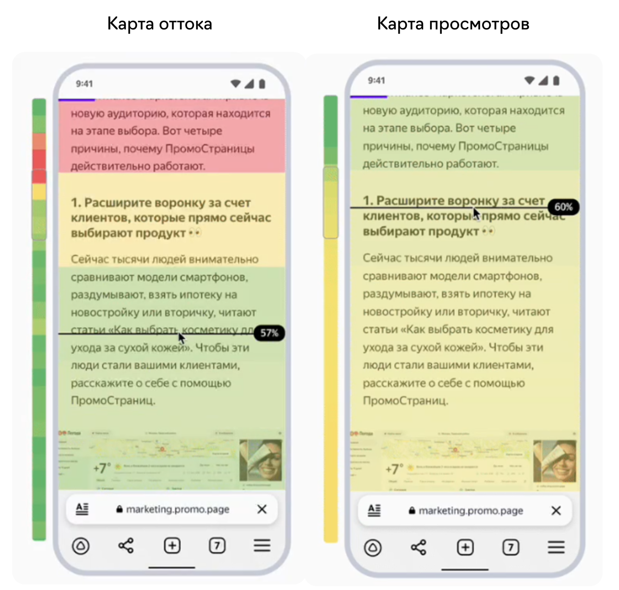 В рекламном кабинете ПромоСтраниц появились два новых инструмента: карта оттока и карта просмотров. Карта оттока показывает, в какой части статьи пользователи теряют к ней интерес. Количество пользователей, которые перестали читать статью, измеряется в процентах и подсвечивается цветом (чем больше процент потери читателей, тем краснее оттенок). Карта просмотров показывает в процентах количество пользователей, прочитавших статью до выделенного абзаца.