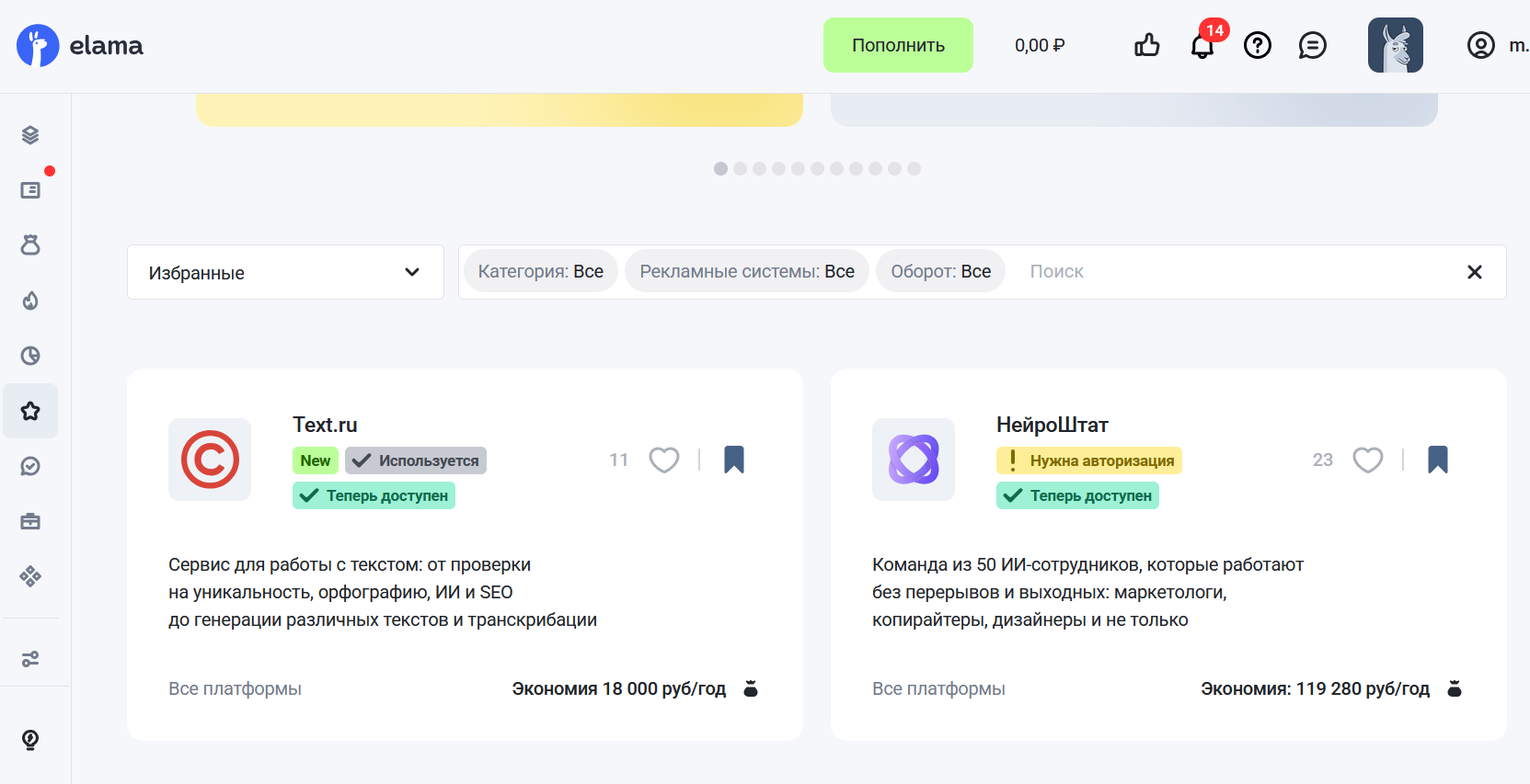 Если использовать инструменты через eLama вы сэкономите 18 000 рублей при работе с Text.ru и более 120 000 рублей — с «НейроШтатом»: eLama уже оплатила их для своих клиентов.