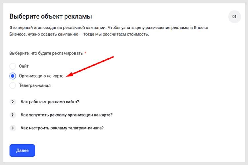 Выберите в списке, что будете рекламировать «Организацию на карте» — это важно для активации скидки.