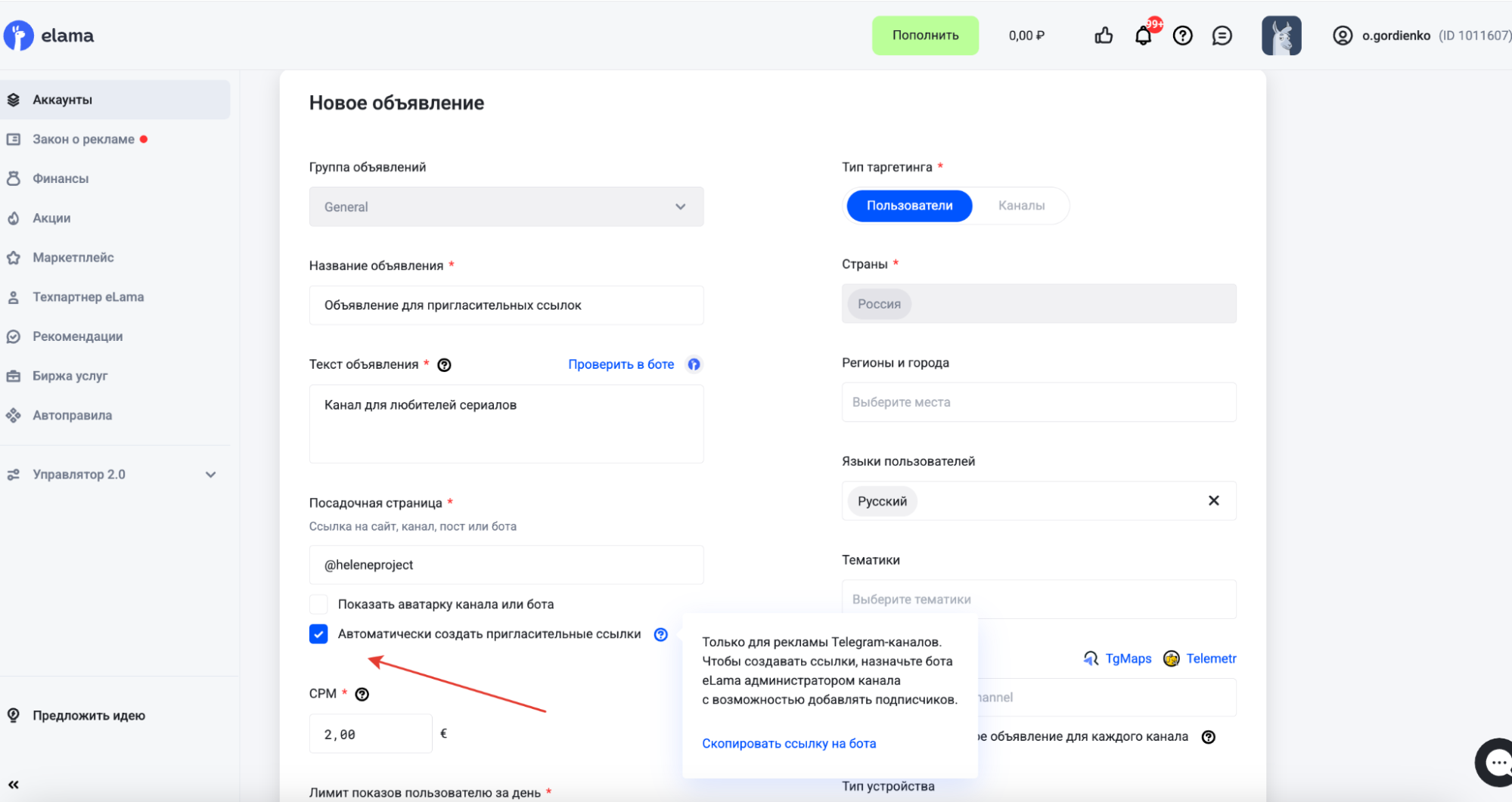 Автосоздание пригласительных ссылок для запуска рекламы Telegram-каналов. Опция работает по структуре «одно объявление — один Telegram-канал/чат-бот для таргетинга», и это поможет клиентам eLama тратить меньше времени на запуск кампаний и их аналитику.