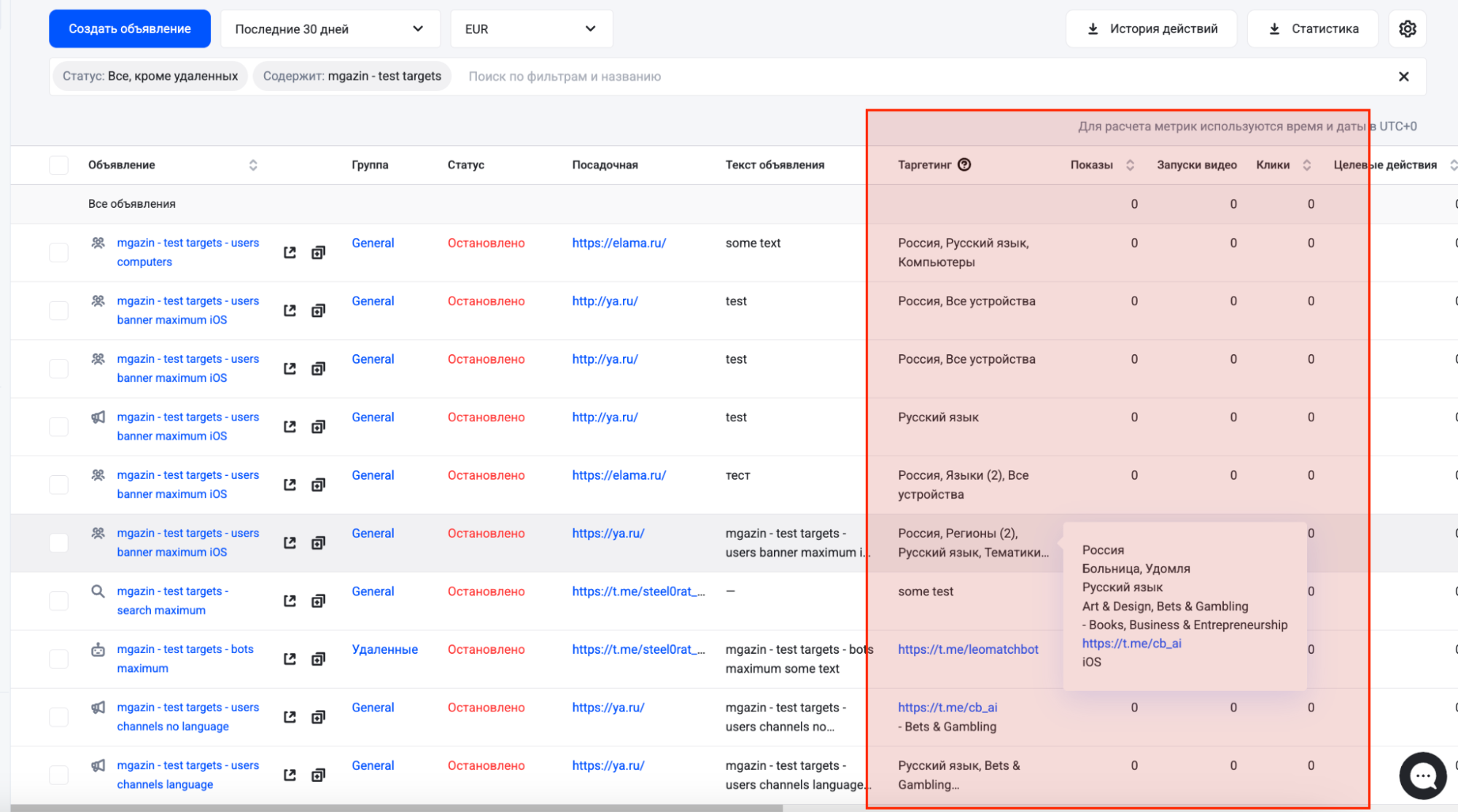Здесь есть агрегированные таргеты без подробностей. Но всё равно нужно заходить в каждое объявление и вспоминать, какие настройки были установлены. Ну и главный минус: в Telegram Ads нет фильтрации по датам — все данные в таблице с момента запуска объявлений. Чтобы оценить, как они отработали, например, за последние семь или 30 дней, надо проваливаться внутрь каждого объявления и грузить статистику вручную.