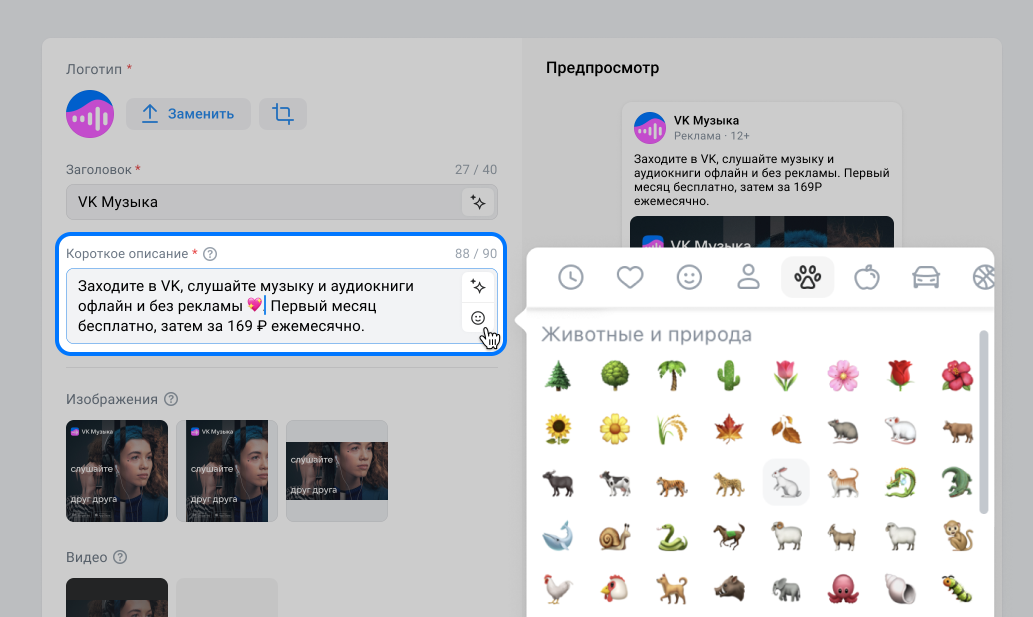 В VK Рекламе теперь снова можно добавлять эмодзи в объявления — не более пяти штук в один рекламный элемент (поле или пост в баннере). При этом их нельзя размещать в заголовках и в юридической информации — это нужно, чтобы избежать заспамленности рекламного сообщения.