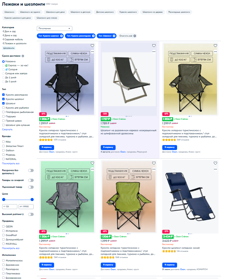 Шезлонги могли хорошо продаваться благодаря удачной сезонности товара, поэтому мы разместили их на Ozon. И не прогадали — структура продаж на маркетплейсе часто отличается от розницы или интернет-магазина, в чем мы и убедились в дальнейшем.