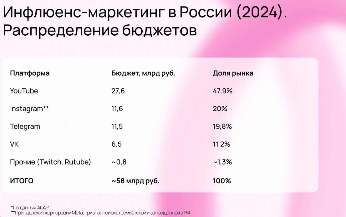 бюджеты Instagram*, по словам Татьяны Ивановой, будут распределены между Telegram, ВКонтакте и YouTube;