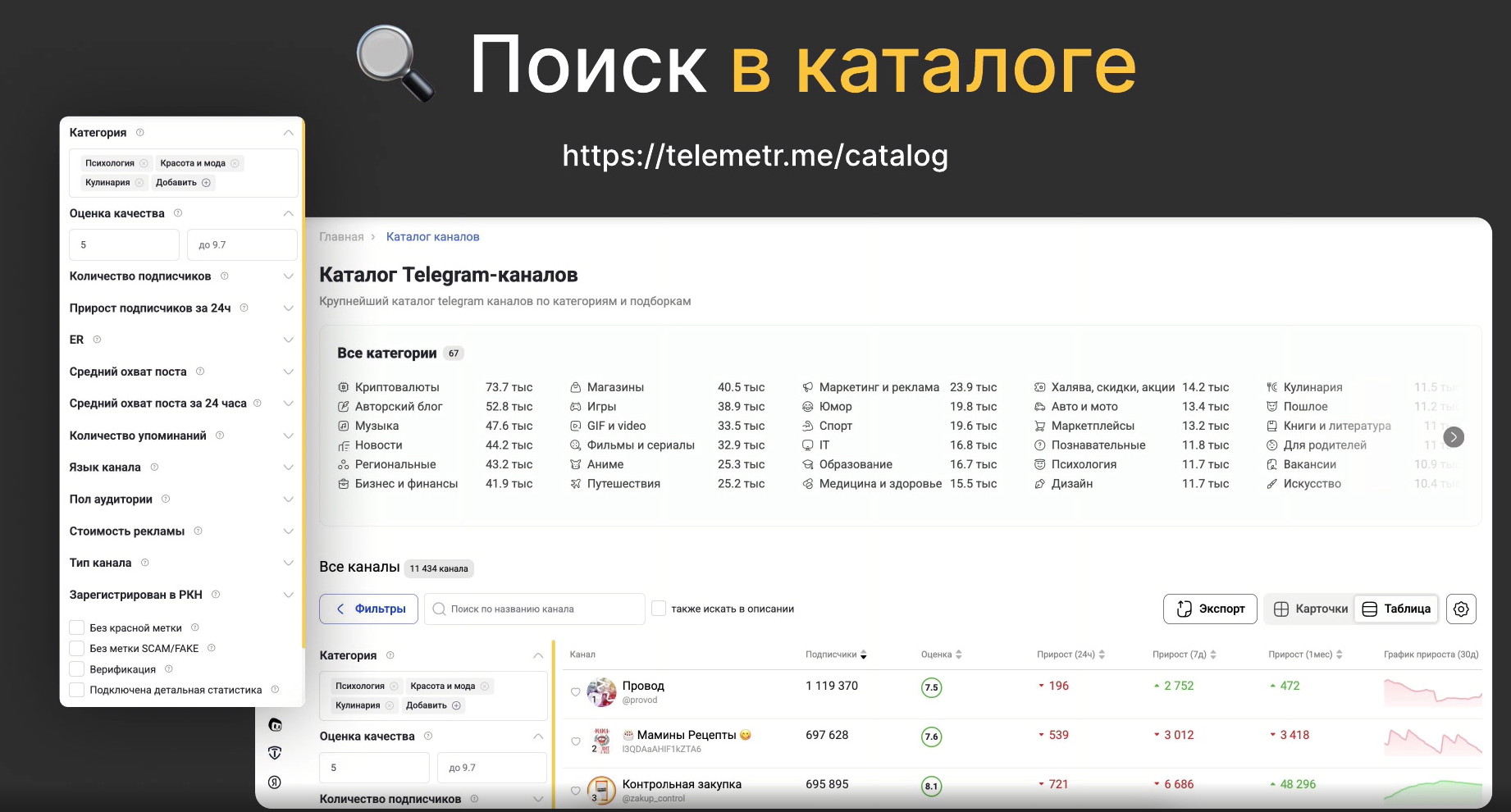 Каталог каналов, где можно отфильтровать их по нужным параметрам: