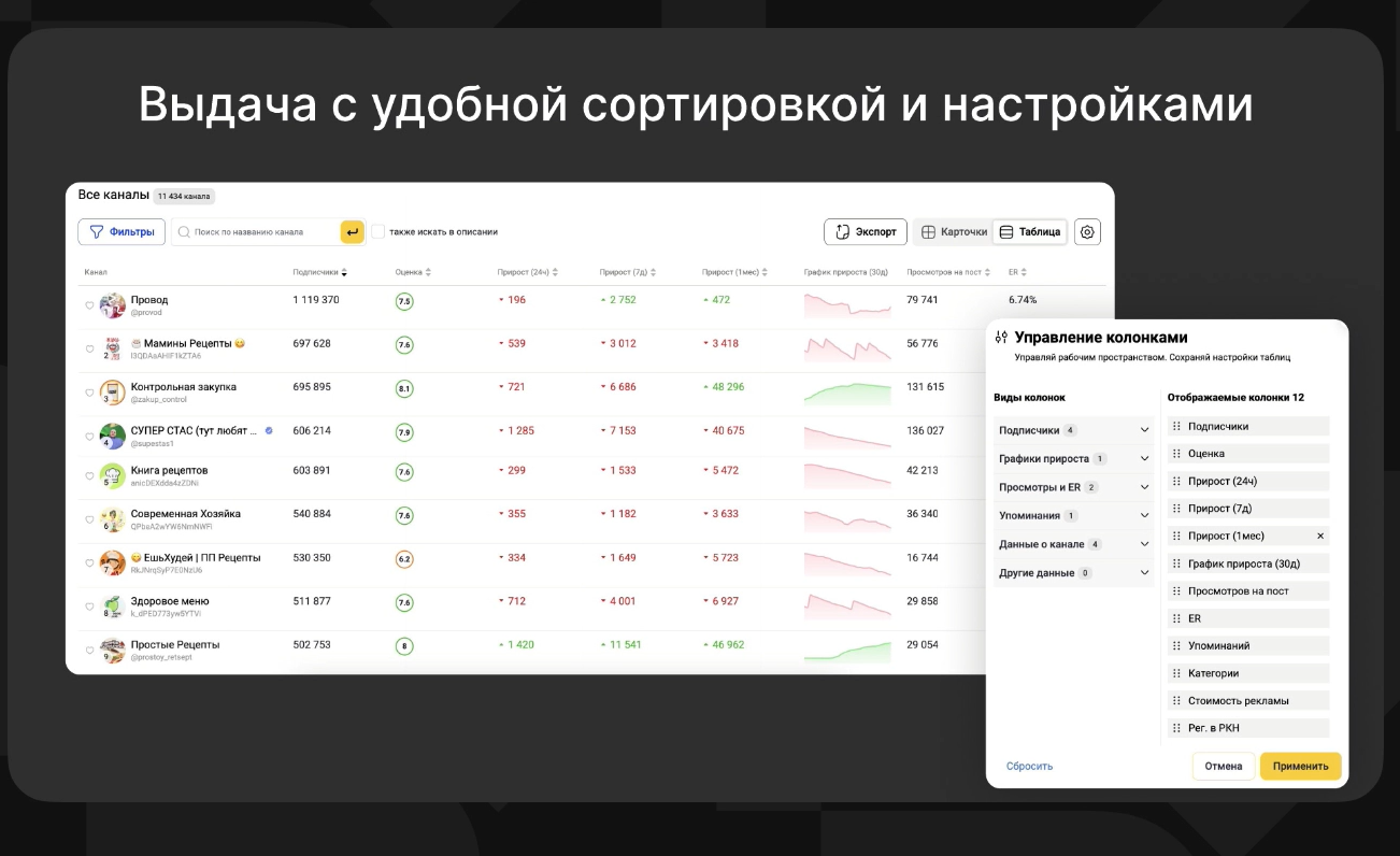 Экспорт выдачи каналов, которые далее можно сортировать по нужному полю для своих задач.