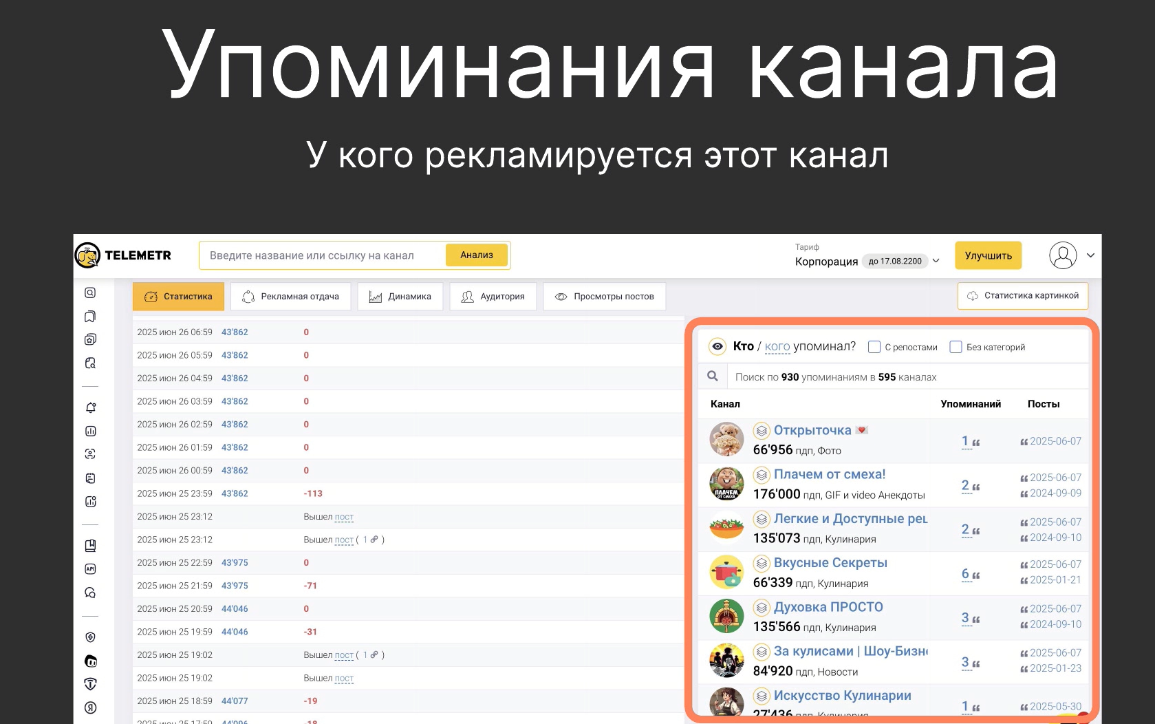 Упоминания канала: источники и каналы, где рекламировался данный канал и откуда к нему пришла аудитория.