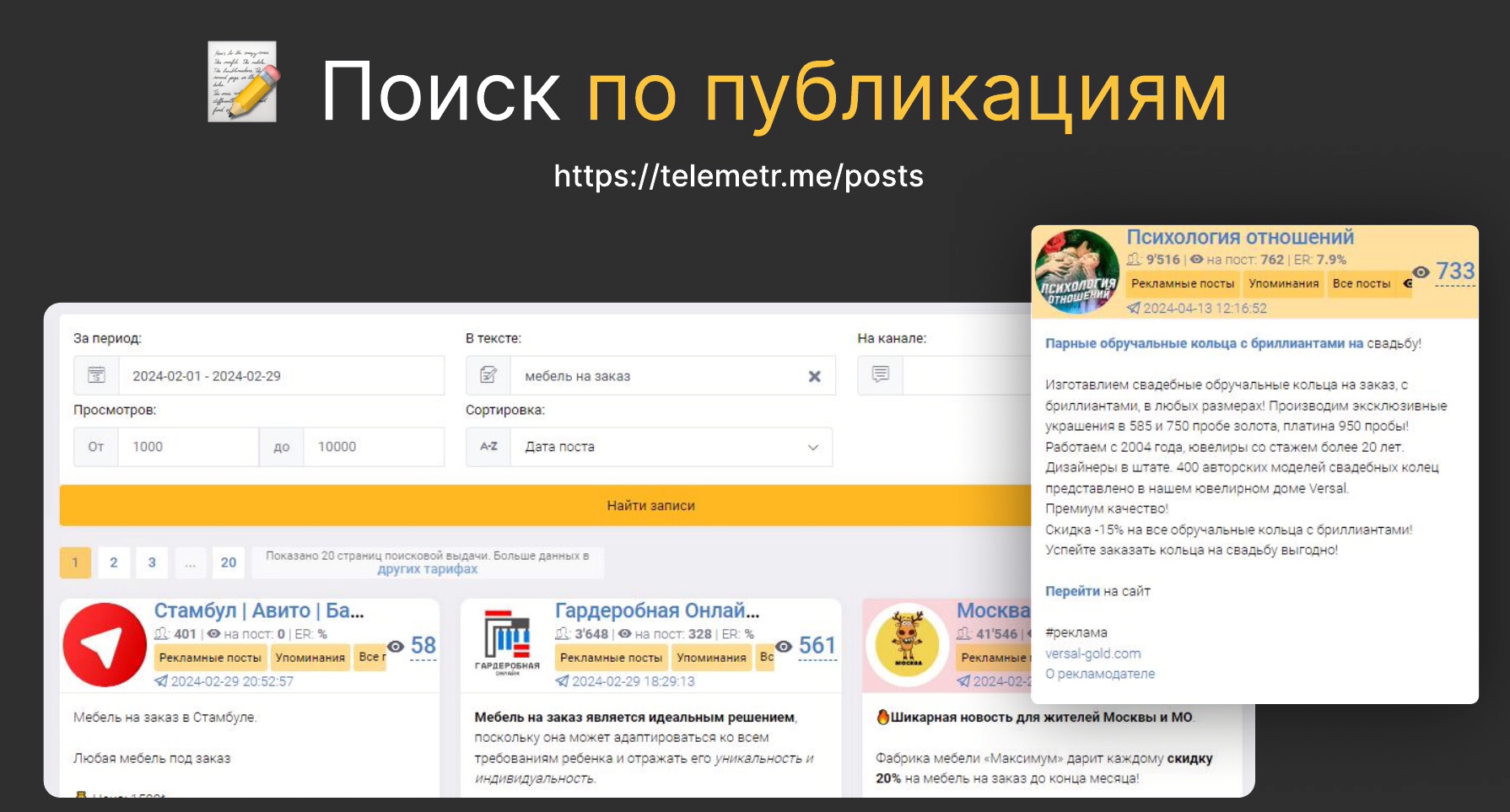 Поиск по публикациям: поиск постов по ключевому слову. Так можно найти рекламные или контекстные посты с хорошей статистикой. У каждого поста указано количество просмотров, комментариев, репостов и пр.
