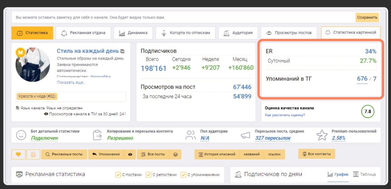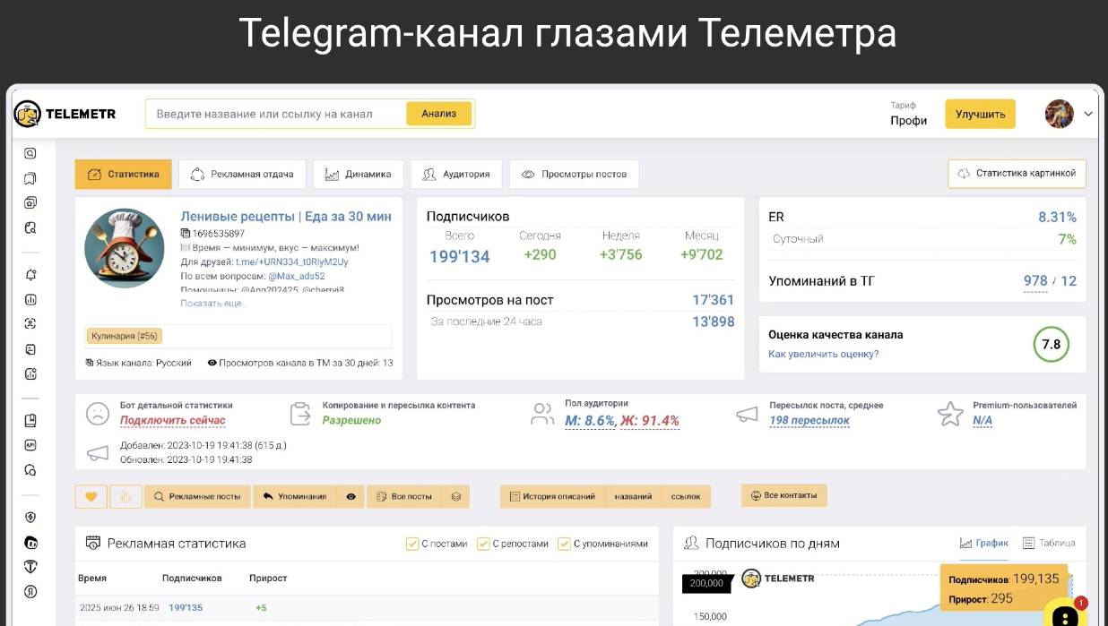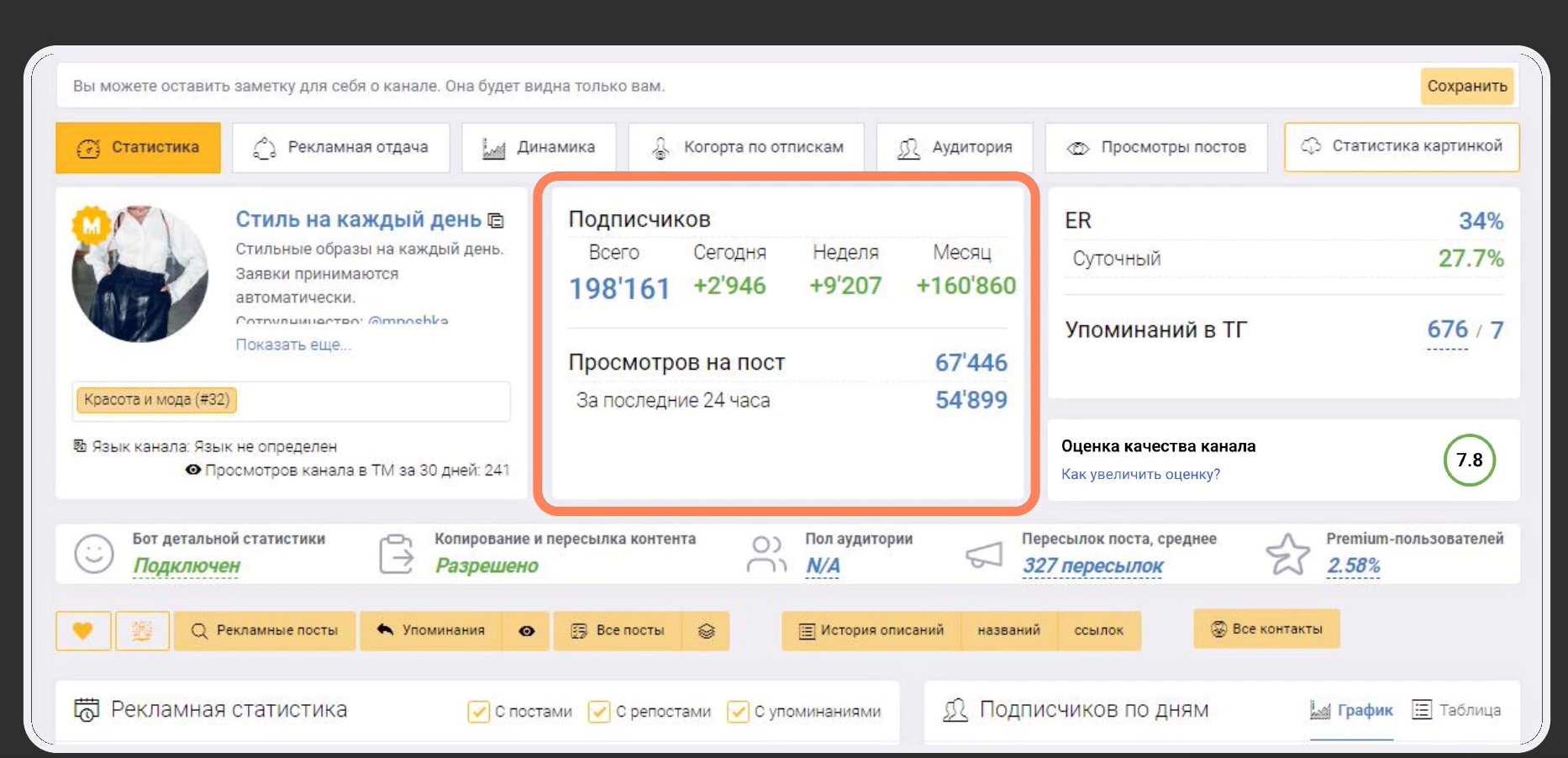 Когда вы собрали список каналов, нужно их проанализировать. В Telemetr.me есть сводный дашборд по каналу со всеми метриками и показателями.