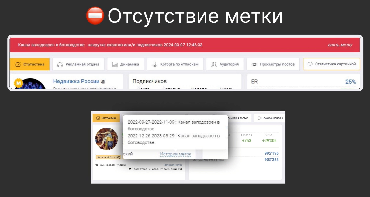 Метка «Канал заподозрен в ботоводстве». Она ставится, если в динамике канала есть всплески, которые говорят о накрутке подписчиков и прочих аномалиях. Продвигаться в таком канале не нужно!