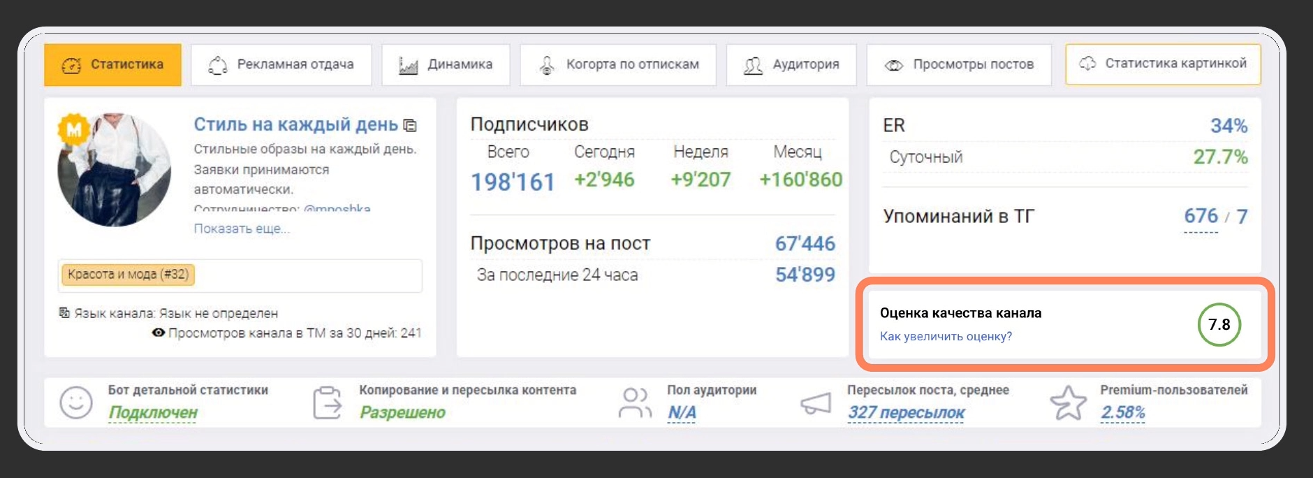 Комплексная оценка качества канала. Она складывается из набора метрик: активность аудитории, публикация постов, манера, с которой канал продвигается в других каналах, и пр. Оценка ранжируется от 0 до 10. Среднестатистический канал, с которым можно работать, имеет оценку от шести и выше.