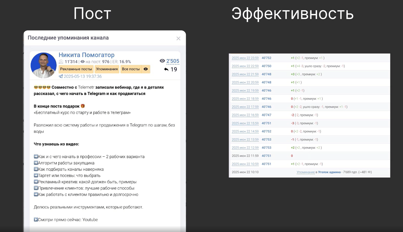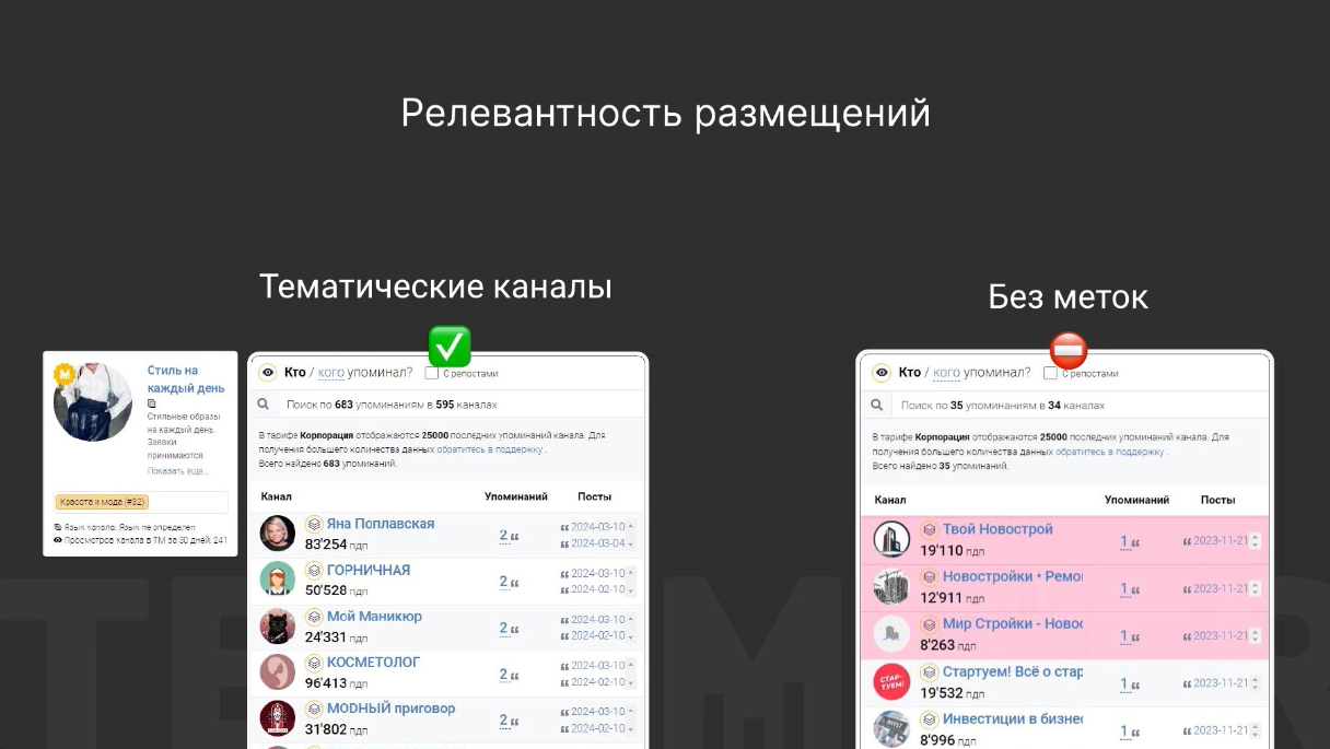 Источники аудитории. Следите за тем, чтобы упоминания были в тематических каналах. Также в списке каналов, которых упоминают и которые упоминают, не должно быть метки. Подробности можно посмотреть в статистике: в каком контексте было упоминание, сколько подписчиков привел пост и пр.