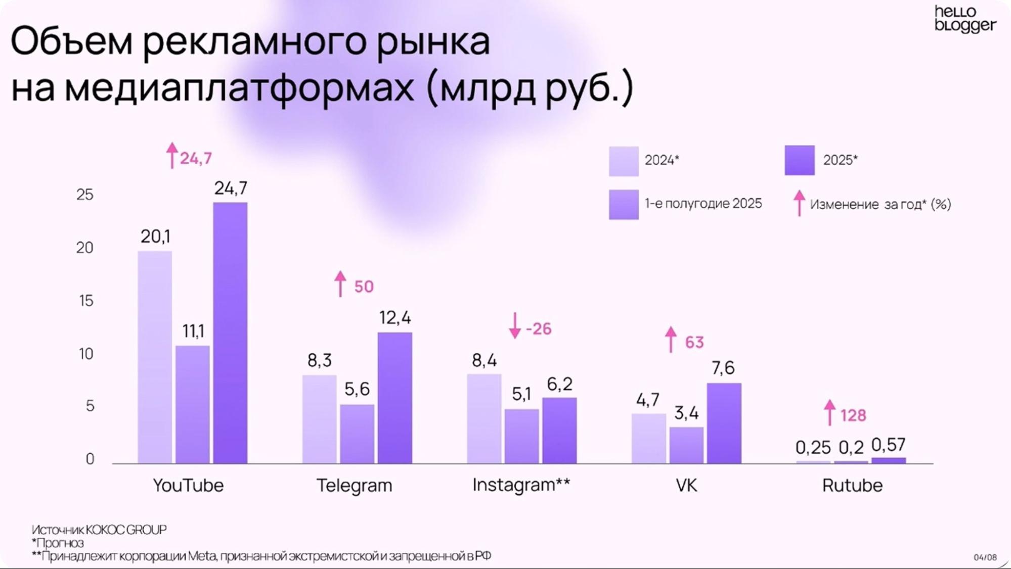 Бюджеты на YouTube снизились в первом полугодии 2025 года по сравнению с прошлым годом, но, по прогнозам аналитиков, к концу года платформа выровняется. Аналогичная ситуация с Telegram и другими площадками.