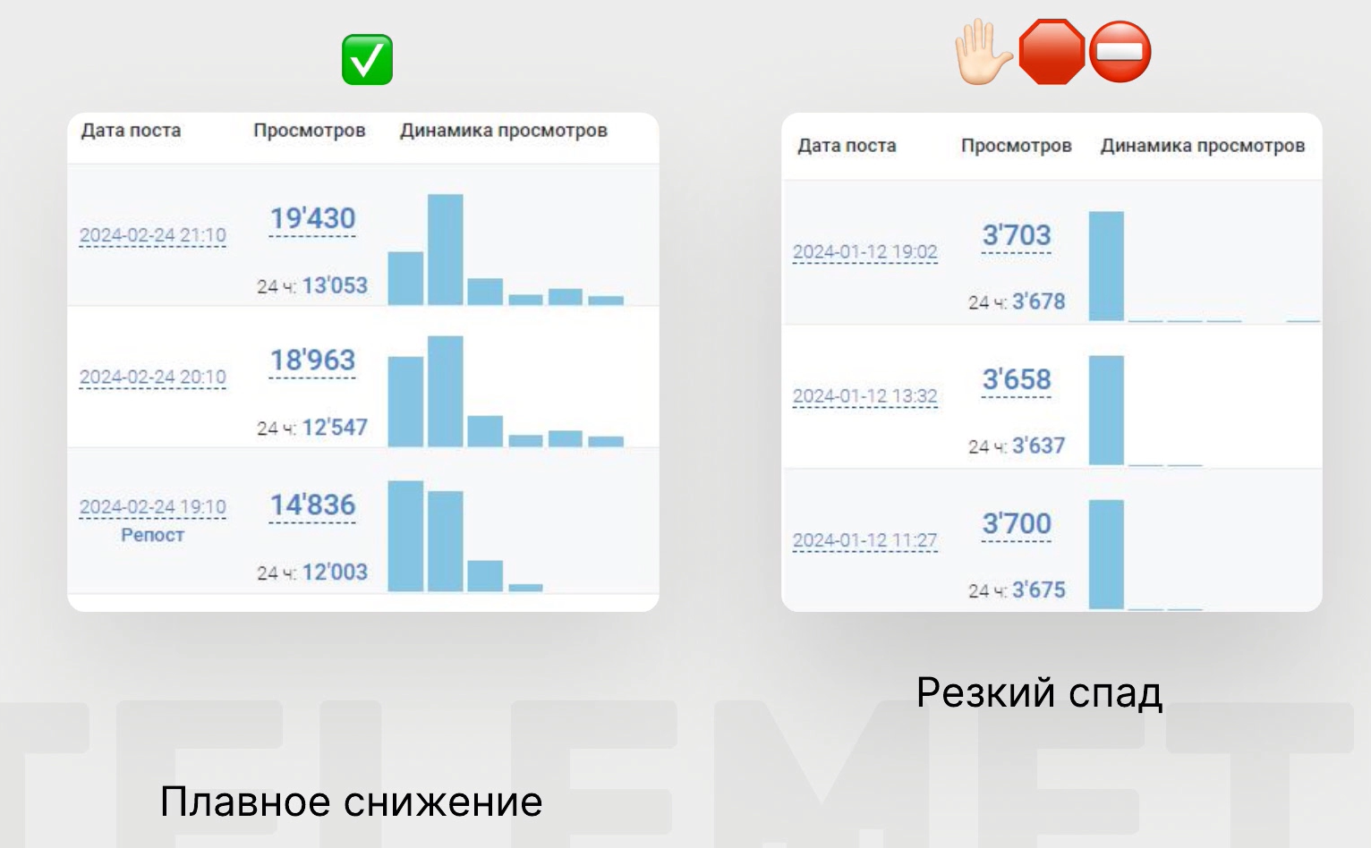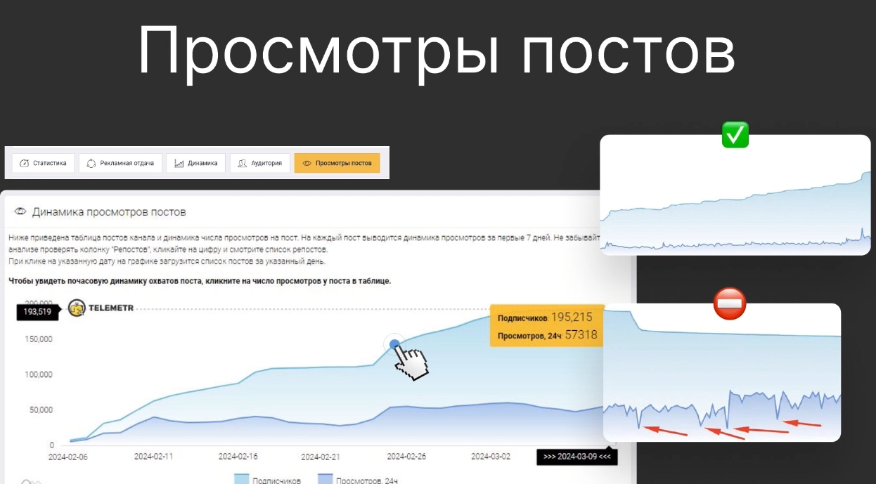 Количество просмотров на пост. В первую очередь смотрите на число просмотров за первые 24 часа. Если это число стремится к нулю, значит, канал не выпускает посты или они неинтересны аудитории.