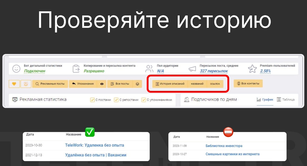 История названий канала. Канал может менять свое название, главное, чтобы это было в рамках одной тематики. Смена аудитории говорит о том, что аудитория будет нерелевантной и не принесет подписчиков и продаж.