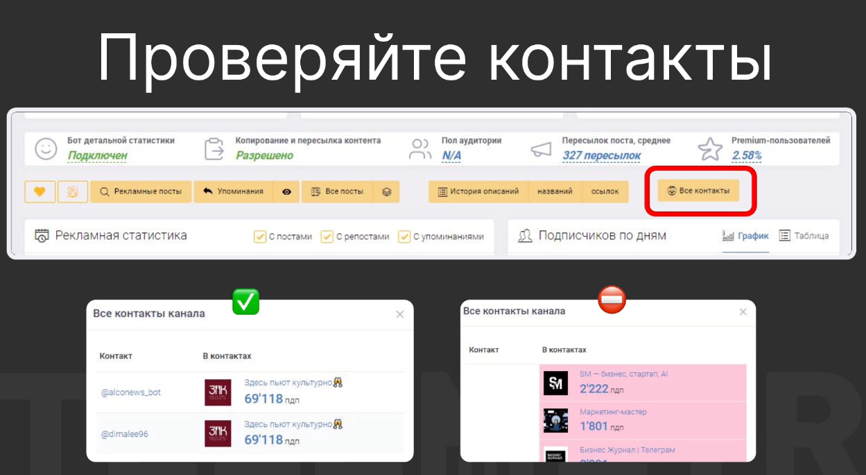 Контакты канала. Важно, чтобы контакты, которые мы соотнесли с этим каналом, не были в каналах, где мы обнаружили накрутку.