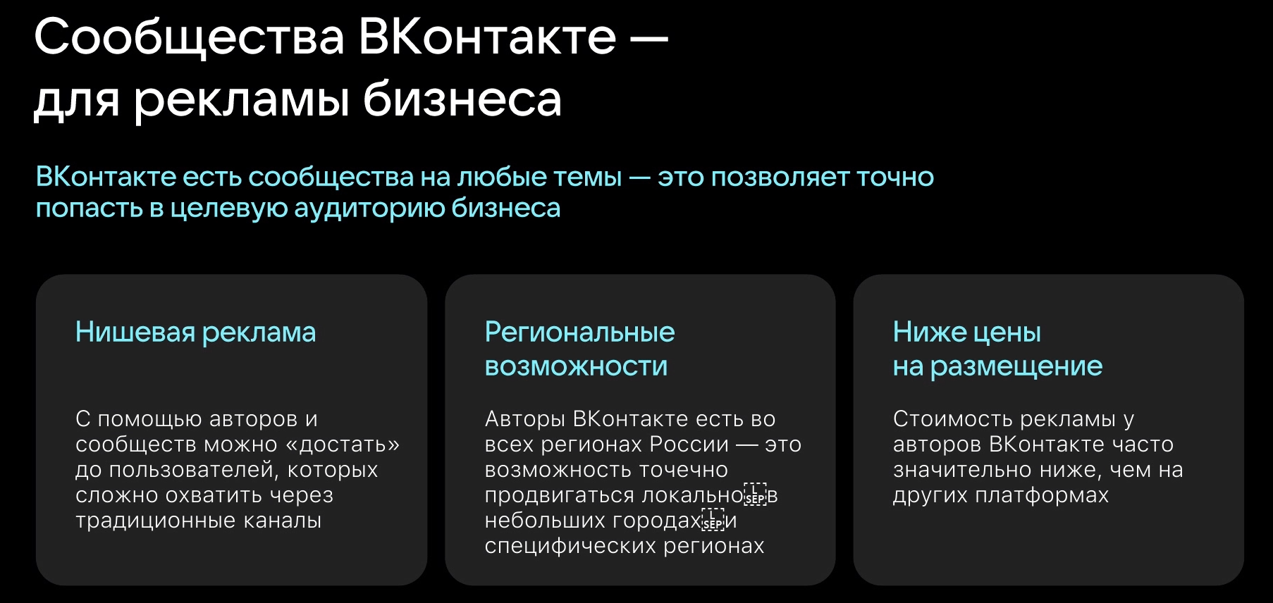 Большой выбор сообществ с помощью различных фильтров по целевой аудитории: географии, метке регистрации сообщества в РКН. Рекламодатель может подобрать для себя базовый минимум или максимум тех сообществ, в которых можно размещаться, делать посевы.