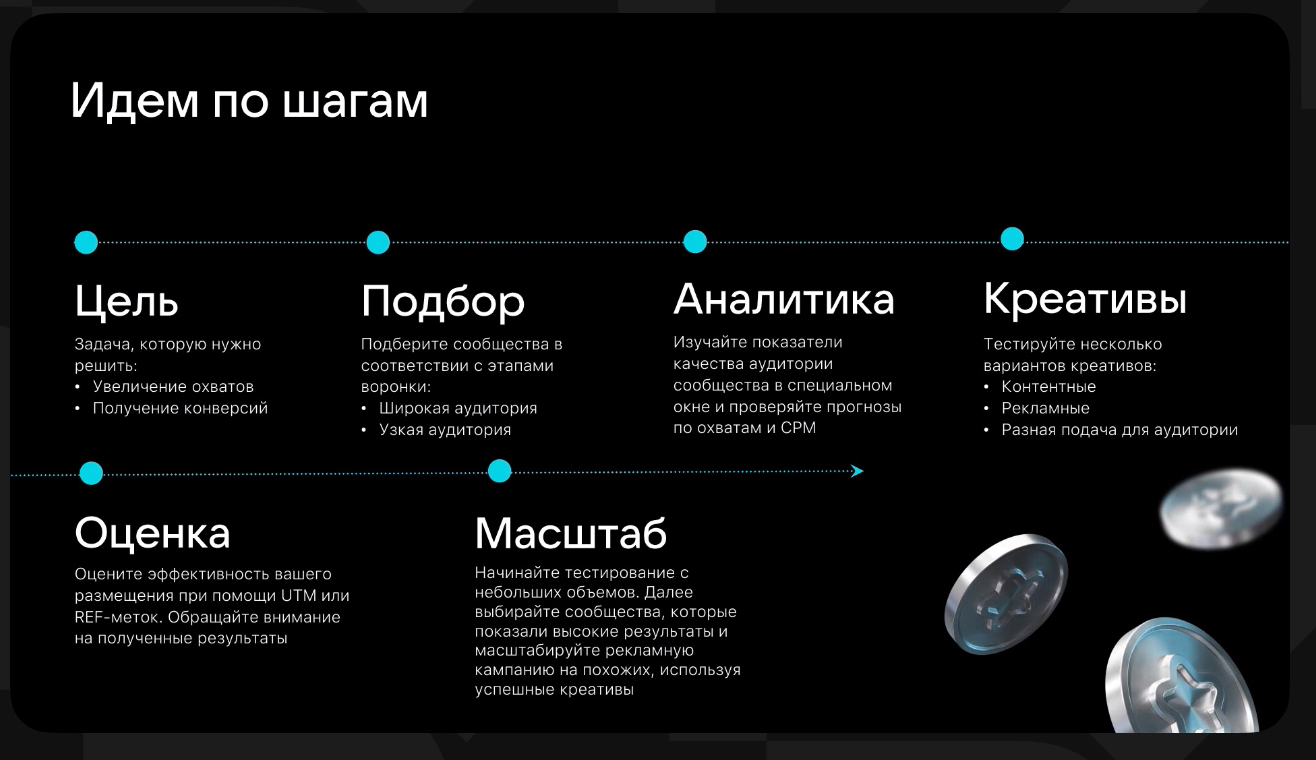 Шаг 2. Подберите сообщества для размещения в зависимости от целей: либо нишевые сообщества, либо крупные охватные, чтобы снижать общий CPM в кампании.