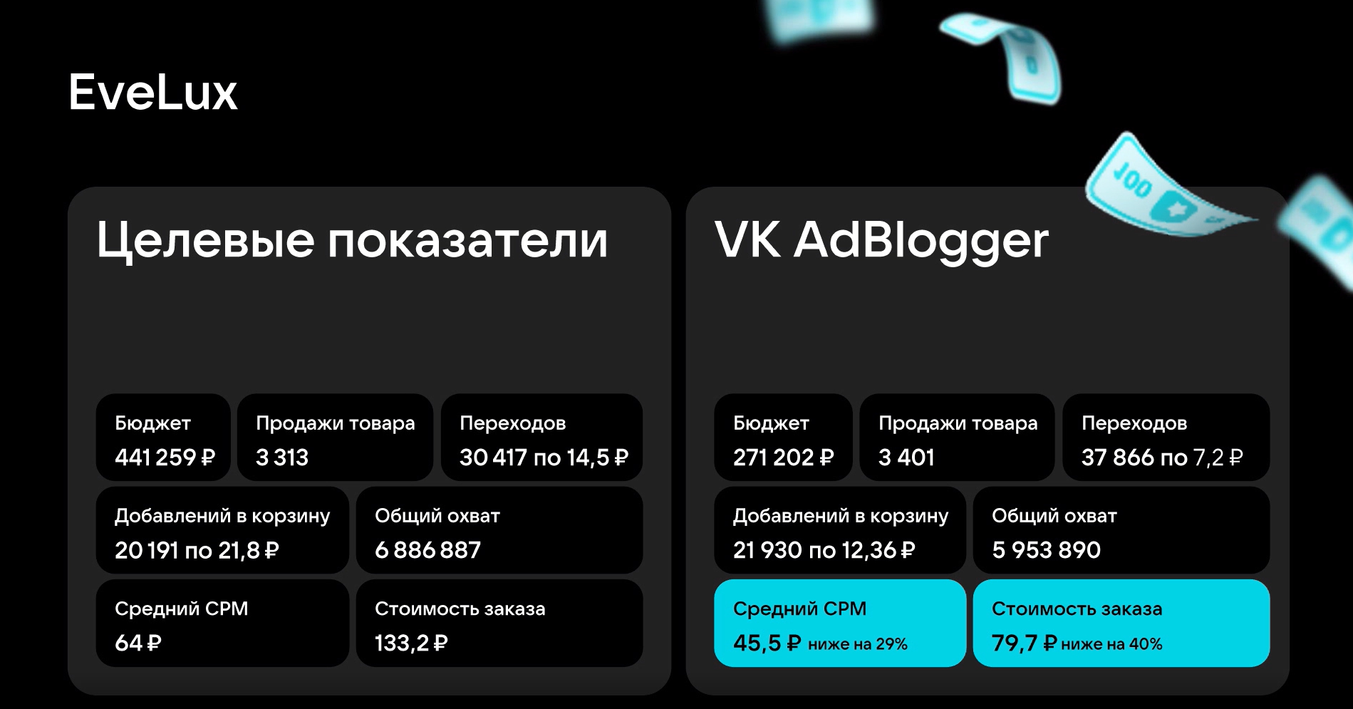 CPM — 45,5 рубля, что ниже запланированного на 29%, а стоимость заказа — 79,7 рубля, что меньше запланированного на 40%.