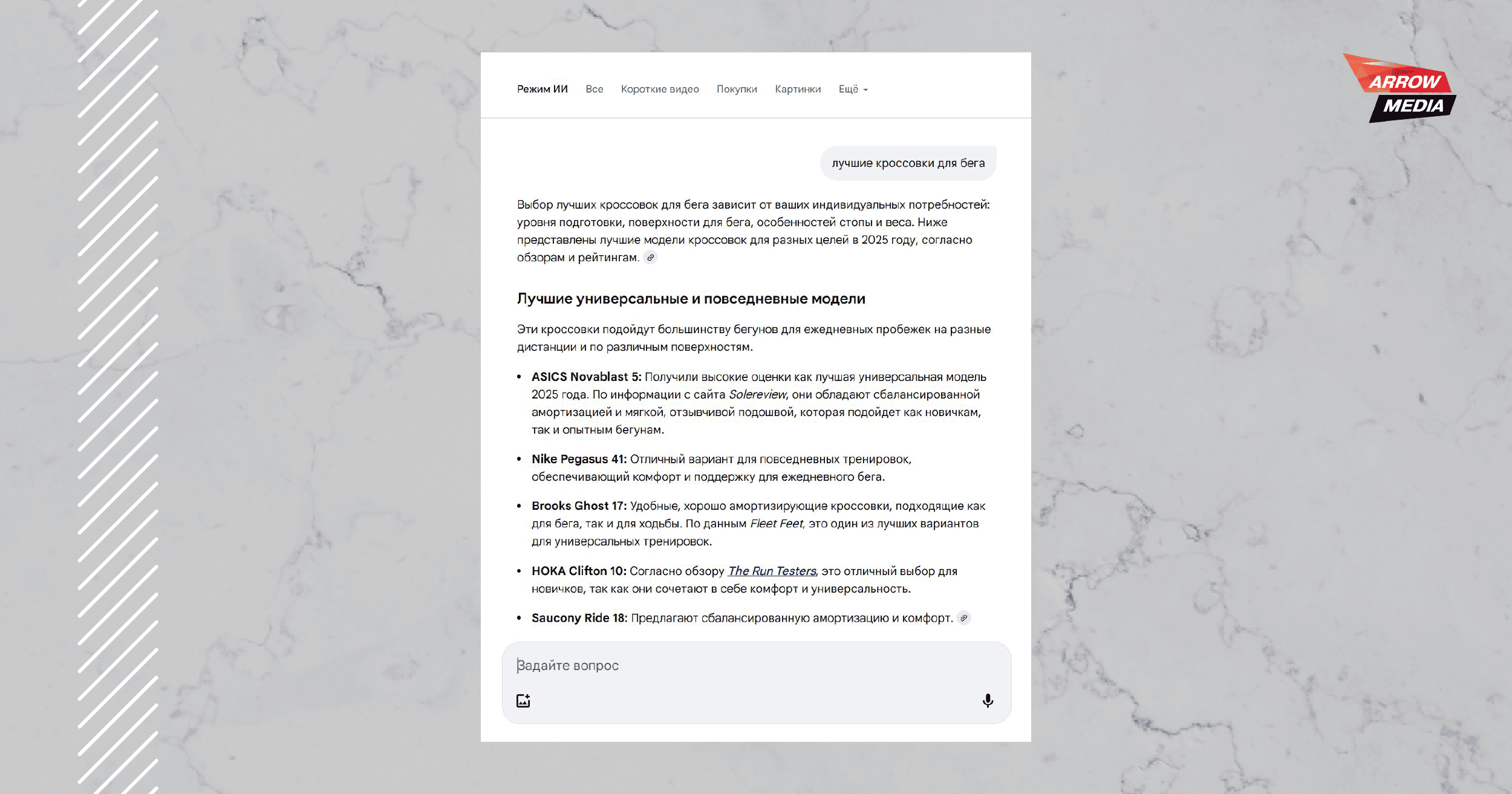 Исчезает этап выбора: люди реже просматривают выдачу и переходят по ссылкам. Это явление называют Zero-Click behaviour (нулевой клик). Например, запрос «Лучшие кроссовки для бега» теперь чаще завершается прямо в Поиске (ИИ сразу строит сравнения и дает рекомендации), пользователю даже не нужно покидать поисковик.