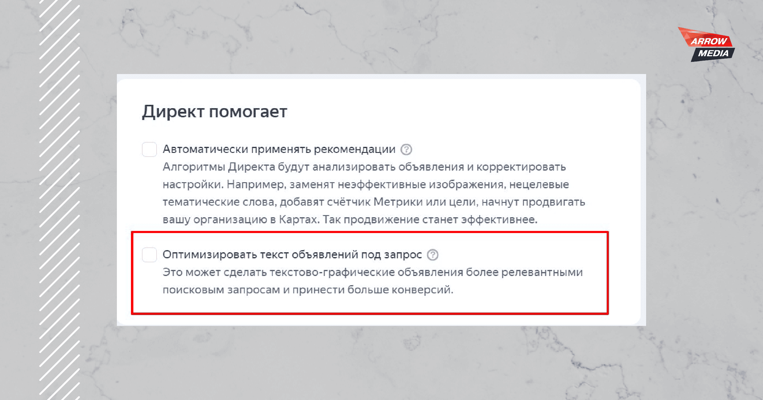 Во-вторых, сделать объявления в Директе более персонализированными можно с функцией «Оптимизации текстов». Она автоматически адаптирует заголовки и описания под запрос пользователя, повышая их релевантность и эффективность.