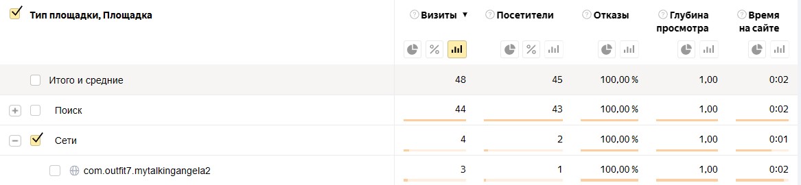Смотрим «Отчеты» — «Источники» — «Директ, площадки». Выбираем «Сети» и ставим одну или несколько указанных метрик. Визиты также фильтруем по устройству (смартфоны).