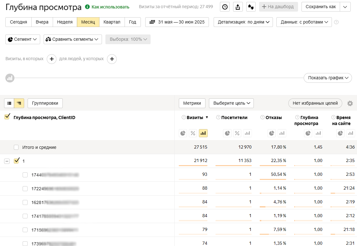 В отчете «Аудитория» — «Глубина просмотра» фильтруем визиты, в которых глубина просмотра менее двух страниц, и добавляем группировку по ClientID. Смотрим на показатель отказов, время на сайте.