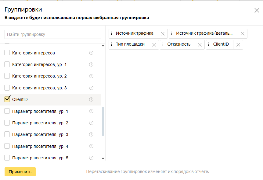Это поможет сосредоточиться на визитах из нецелевых городов и стран. Чтобы создать сегмент, используйте группировку по ClientID.