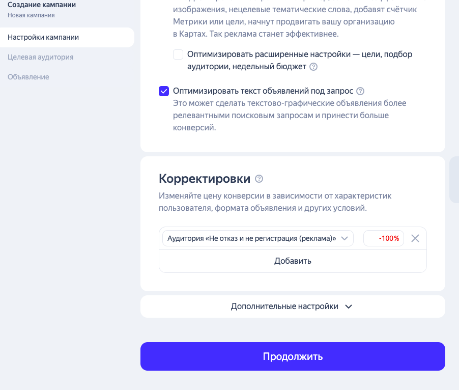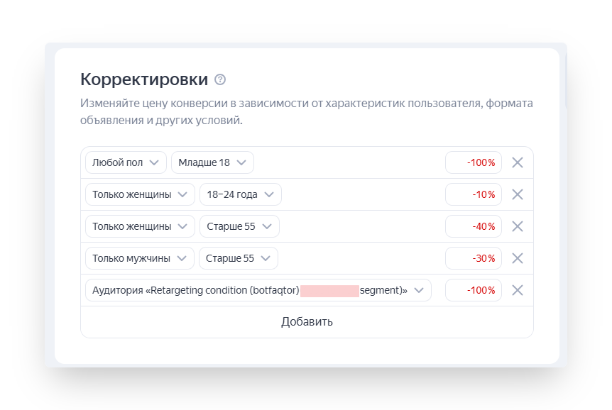 Далее нужно будет запретить показы рекламы этим сегментам через корректировки в настройках рекламной кампании.