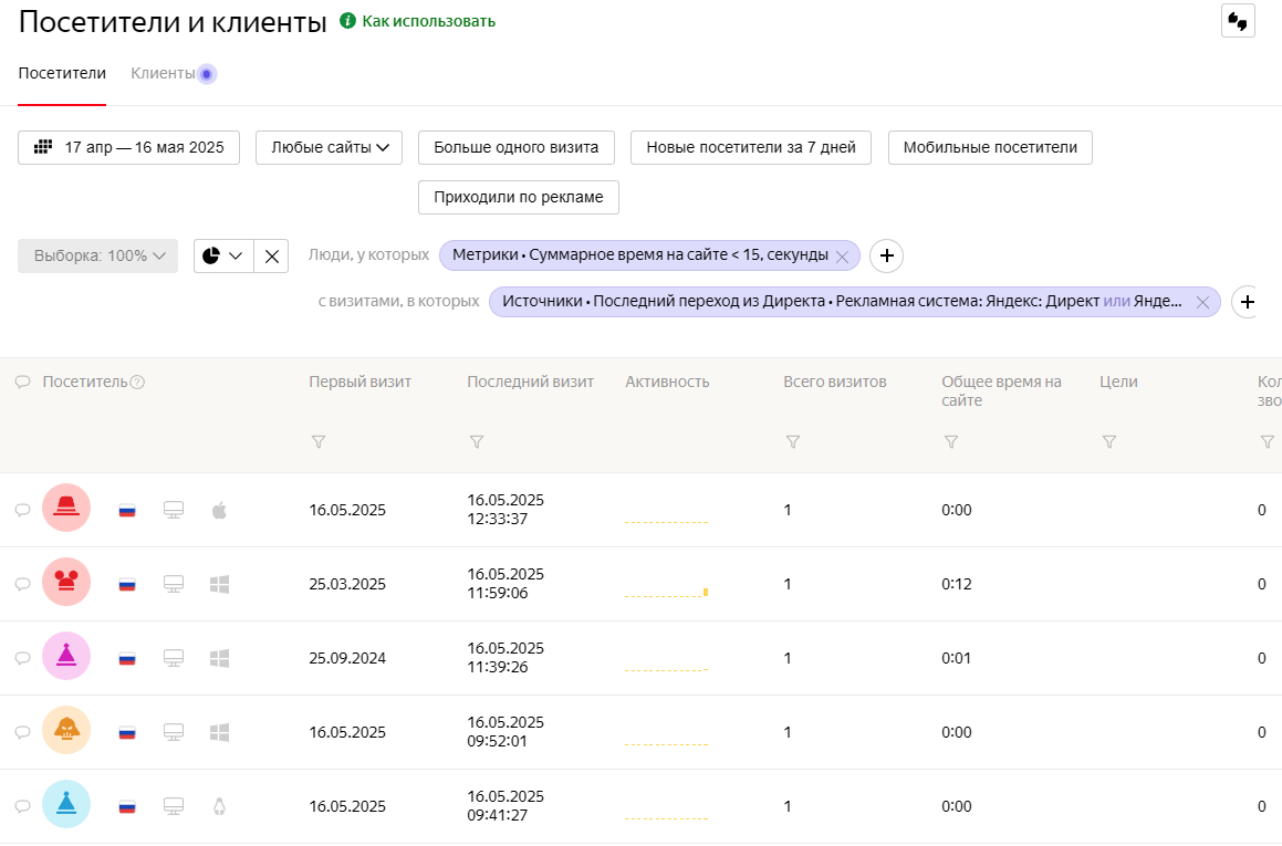 В Метрике анализируем визиты, группируем их по посещаемости, отказам, конверсиям, количеству кликов и объединяем в сегменты. Эти сегменты в дальнейшем нужно будет добавить в «Корректировки» для блокировки показов.