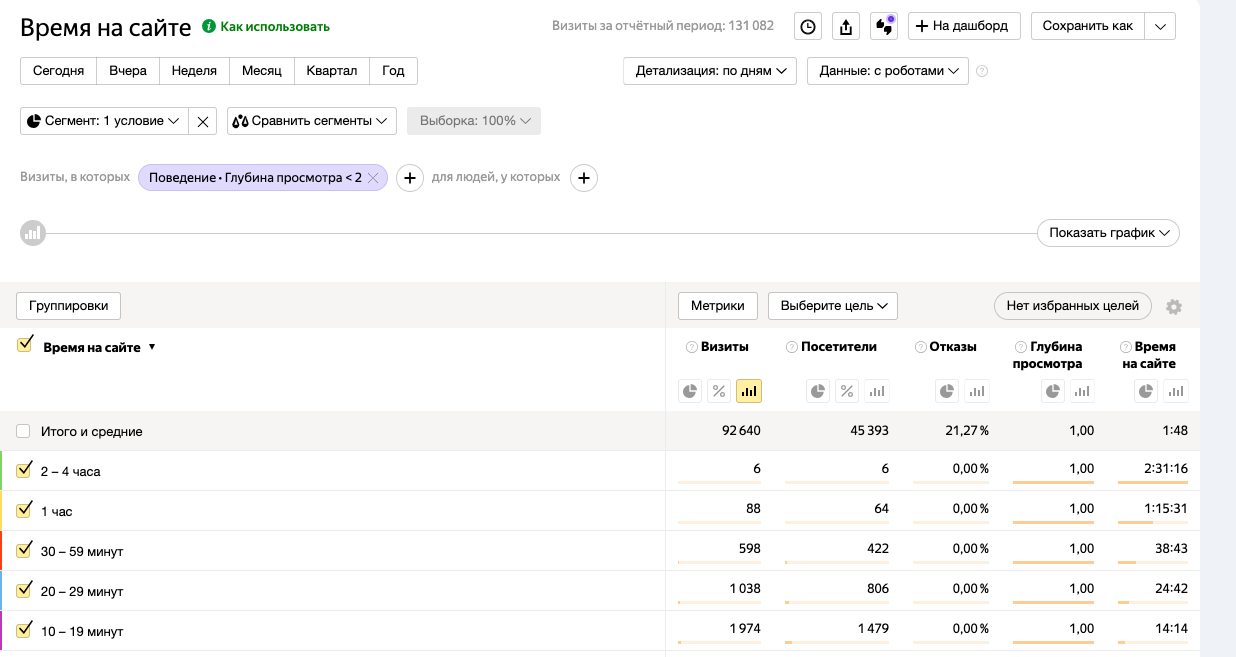 Также можно посмотреть в разрезе других ответов, например, «Время на сайте». Здесь необходимо отфильтровать визиты по глубине просмотров менее двух страниц.