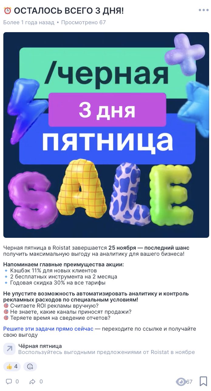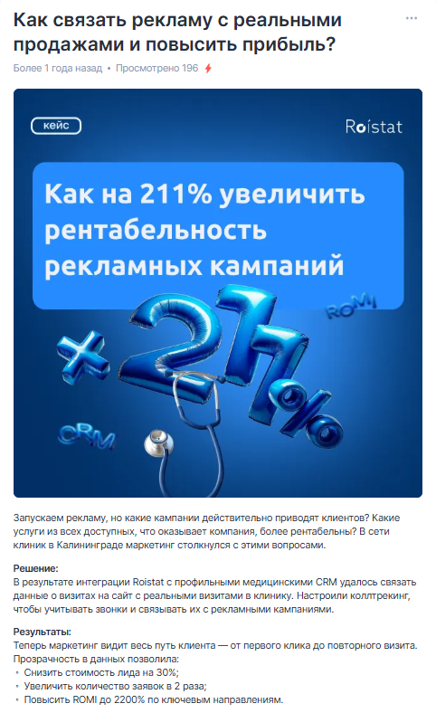 В итоге пришлось принимать правила игры, ведь раньше в среднем мы получали 156 просмотров на один пост. Это значит, что публикации Roistat показывались только подписчикам и почти не попадали в рекомендации.