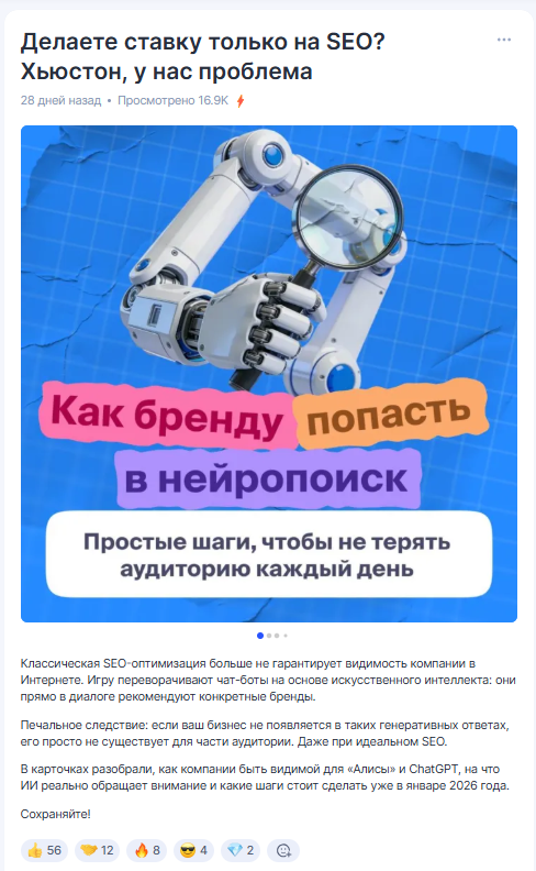 На практике всё часто выглядит так: компания публикует материалы, но посты висят в ленте и не дают ни охватов, ни репостов, ни лидов. Вскоре хочется обвинить во всём площадку: мол, алгоритмы работают плохо, подписчики «не выкупают», а ведение профиля просто отнимает время.