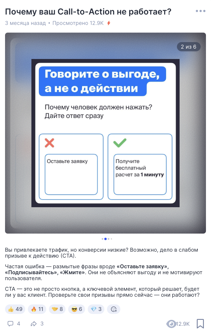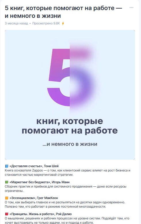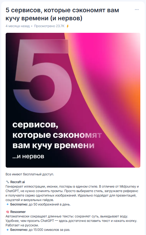 Контент стал самодостаточным: вся ключевая ценность — внутри поста. Алгоритм это увидел и начал активнее рекомендовать наши материалы новой аудитории. Например, текст про пять сервисов, которые экономят кучу времени и нервов, набрал более 23 500 просмотров и 153 реакции. Годом ранее, к слову, мы получали около 5–6 откликов на пост.
