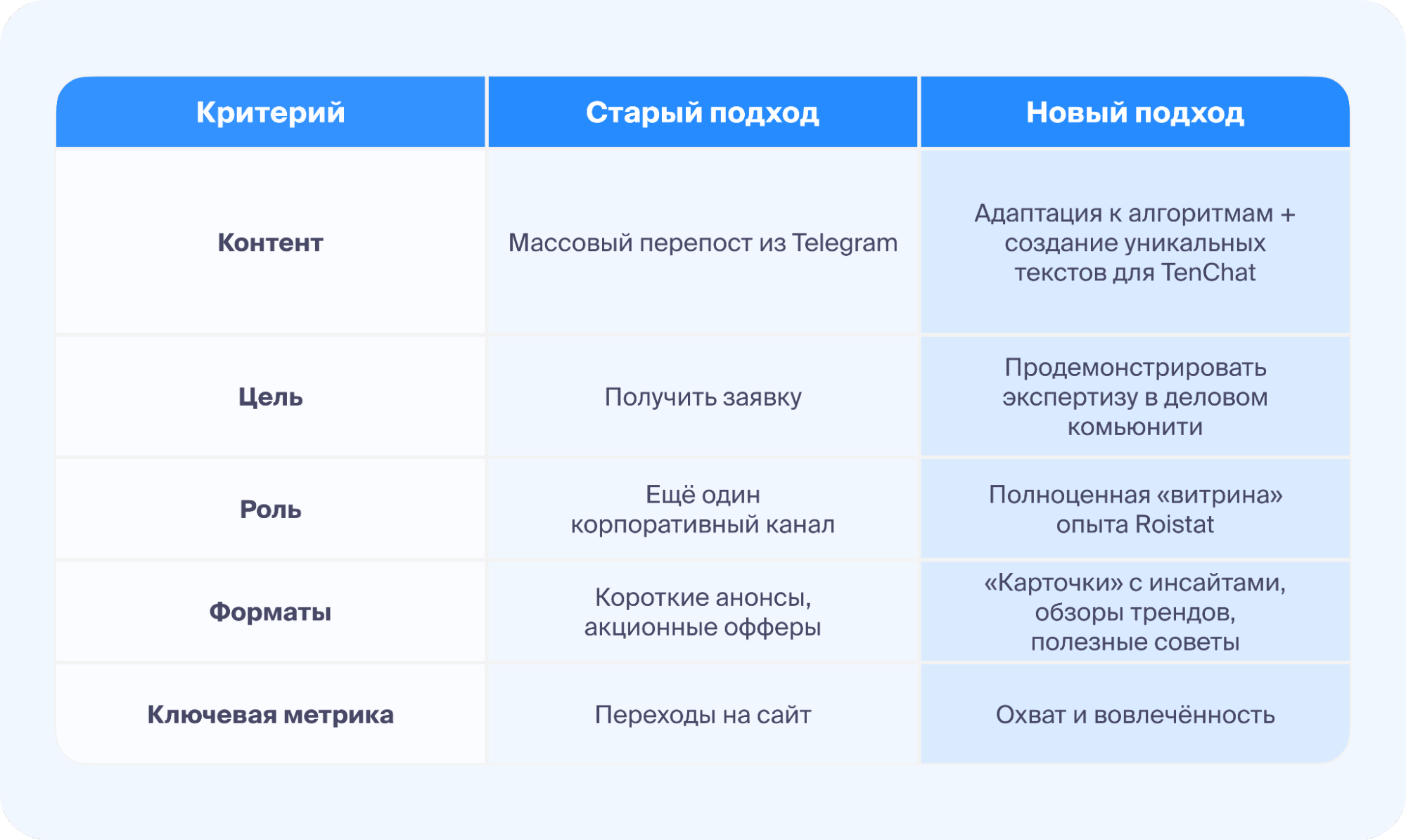 Старый подход строился на логике «скопировать и вставить»: тот же контент, те же офферы и те же ожидания, что и в Telegram. Мы говорили от лица бренда, гнали трафик наружу и оценивали площадку по лидам. В итоге контент не совпадал ни с поведением аудитории, ни с логикой алгоритма TenChat — так что посты пессимизировались и были видны в лучшем случае подписчикам.