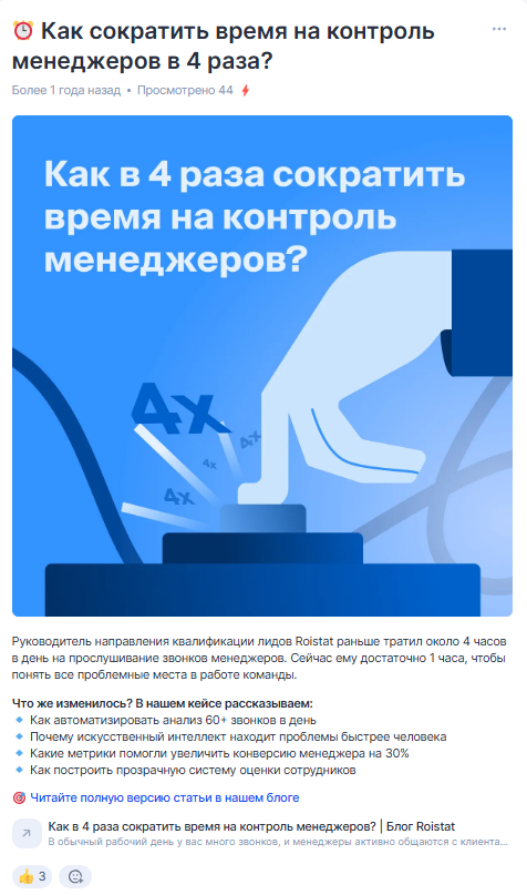 Мы вывели вперед экспертов Roistat. Публикации стали чаще выходить от имени конкретных специалистов — с их фотографией, должностью и личной подачей. Это помогло показать, что за нашим брендом стоят реальные профи, а публикуемые советы и рекомендации опробованы на себе.