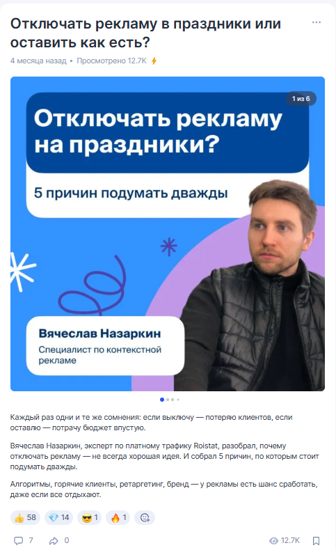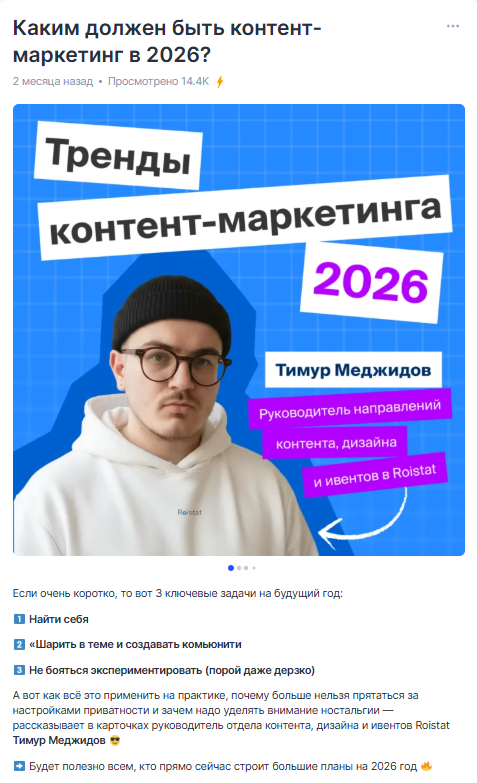 Мы всегда говорили от имени Roistat и практически не акцентировали внимание на экспертизе сотрудников, даже когда они присутствовали в материалах. Для TenChat это критично, потому что площадка строится вокруг нетворкинга и личного опыта. Пользователи охотнее взаимодействуют с конкретными специалистами, чем с безликим корпоративным профилем — даже если бренд им знаком.