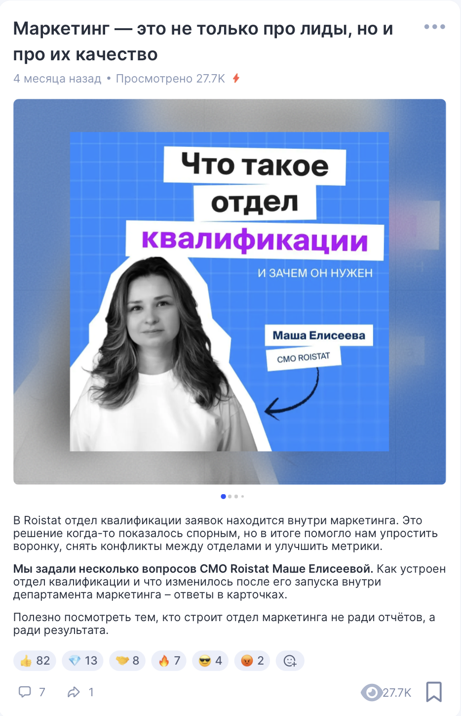 Мы взяли контент, который хорошо продвигается в TenChat — карточки про отдел квалификации. В них мы рассказали об опыте Roistat по переводу этого подразделения из продаж в маркетинг, причем сделали это от лица директора по маркетингу, чтобы повысить доверие.