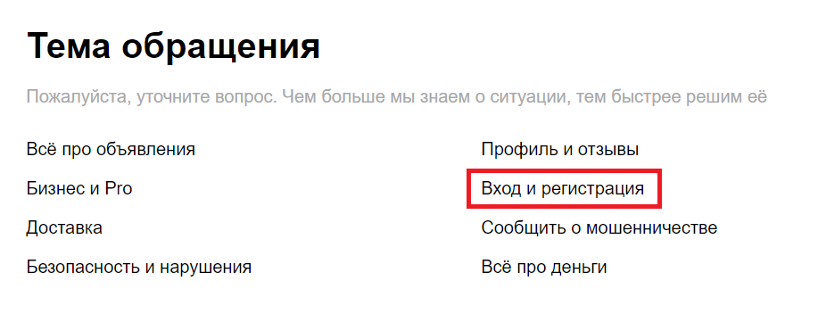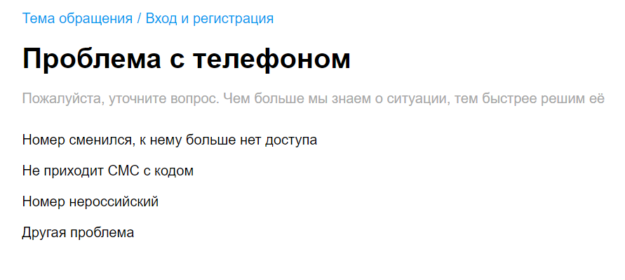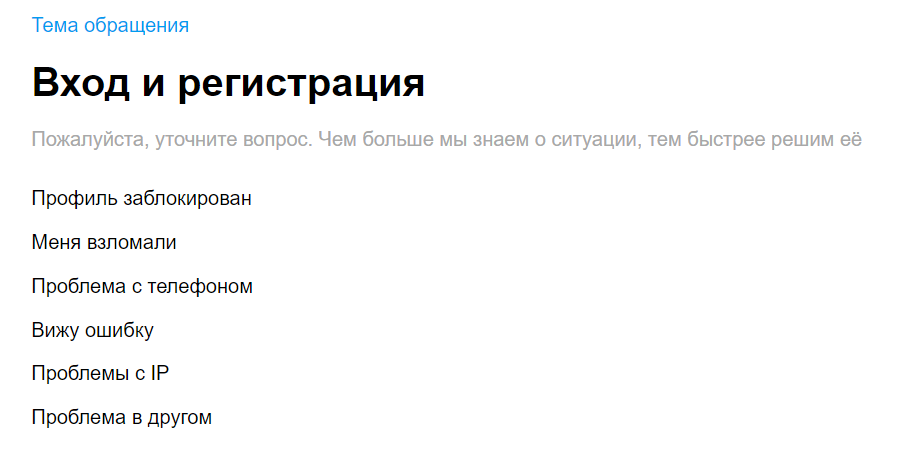 Шаг 4. Определитесь с темой вашего обращения. Это поможет направить запрос сразу тем специалистам, которые решат проблему быстрее всего. Например, вы не можете войти в свой аккаунт — в таком случае выбирайте тему «Вход и регистрация».