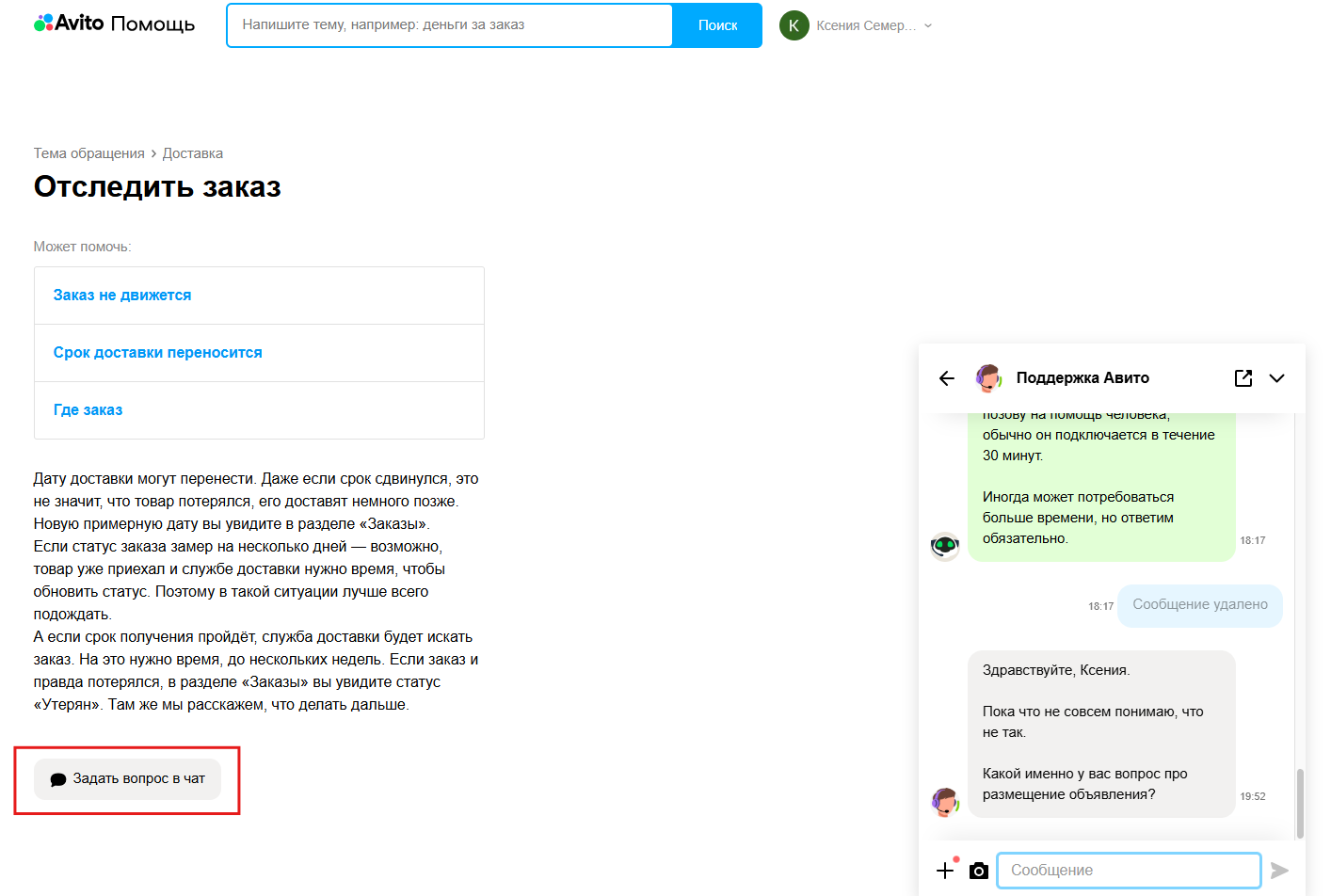 Также в некоторых разделах может быть кнопка «Задать вопрос в чат», например, если вы не знаете, где ваш заказ.