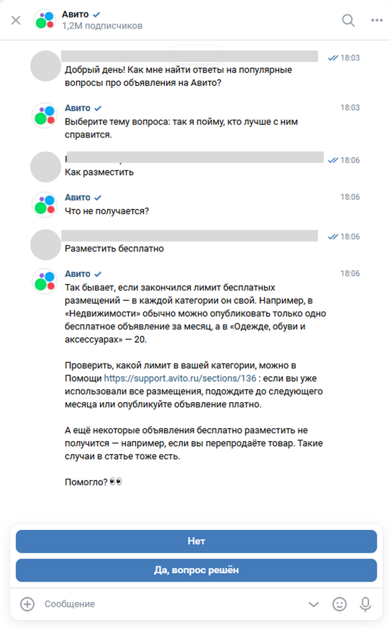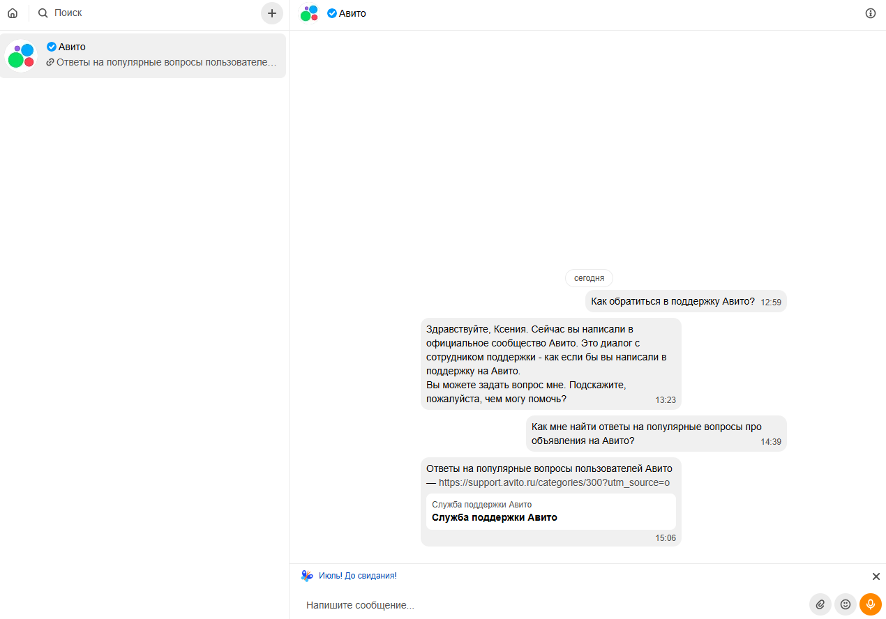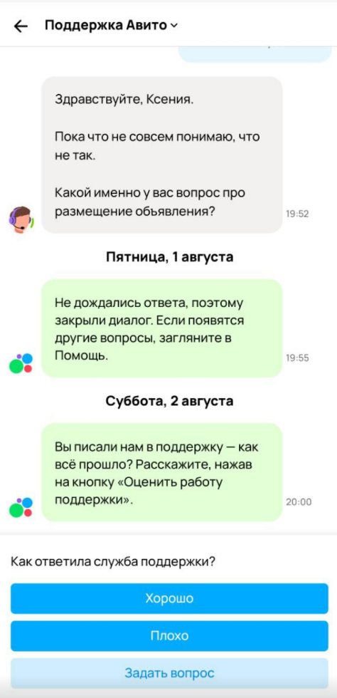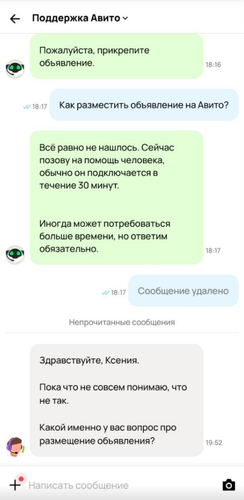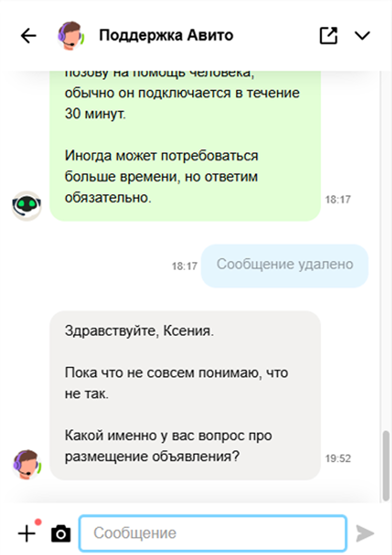 Робот поддержки Авито дает шаблонные ответы. Для решения простых проблем этого достаточно. На сложные вопросы отвечают операторы: делают это подробно и подсказывают, как действовать дальше.