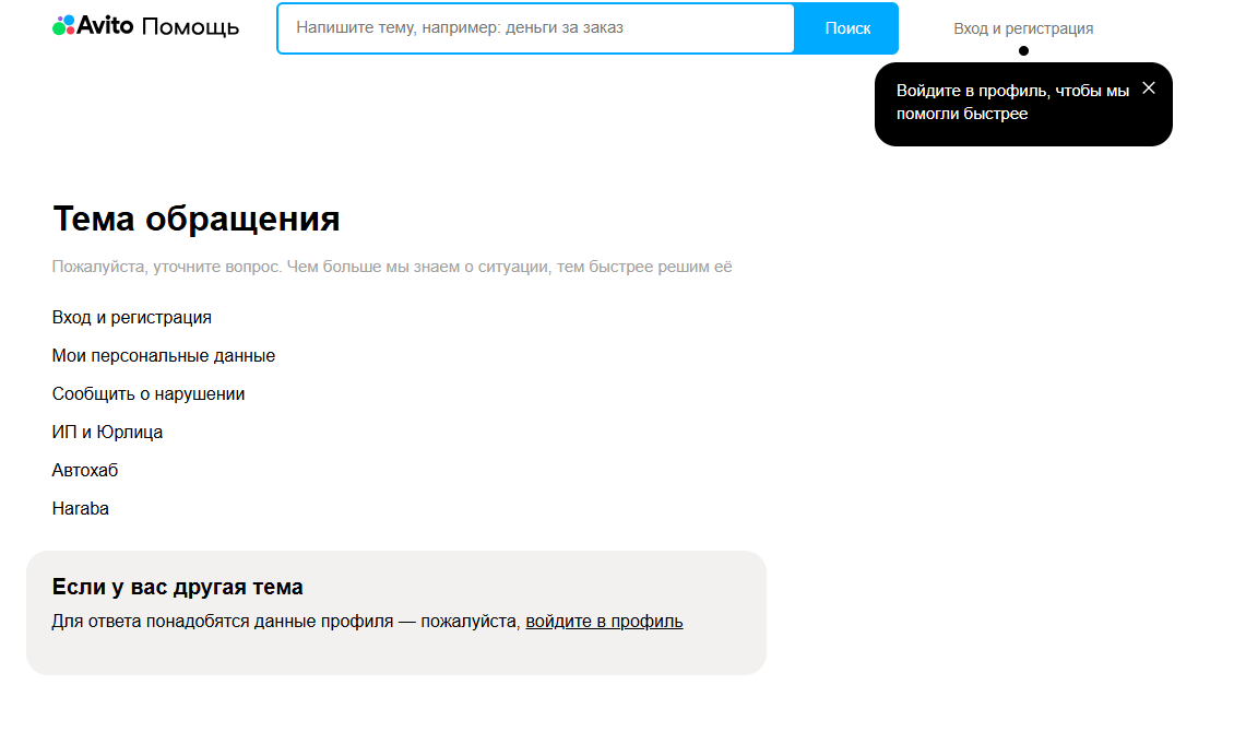 По другим вопросам Авито рекомендует сначала войти в профиль, а потом писать обращение в поддержку.