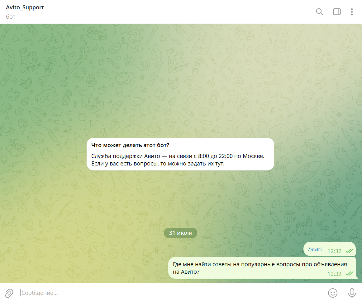 Официального аккаунта поддержки Авито в Telegram на сайте платформы нет. Через поиск в Telegram мы нашли бота поддержки Авито, но диалог не состоялся.