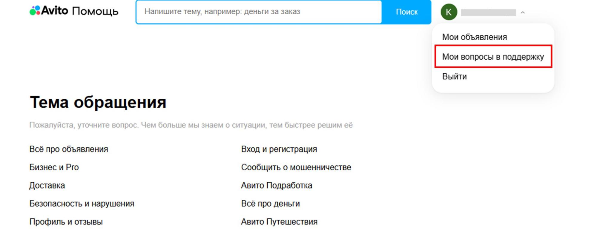 На сайте поддержки Авито кликните «Мои вопросы в поддержку». Статус будет указан перед номером и датой обращения.