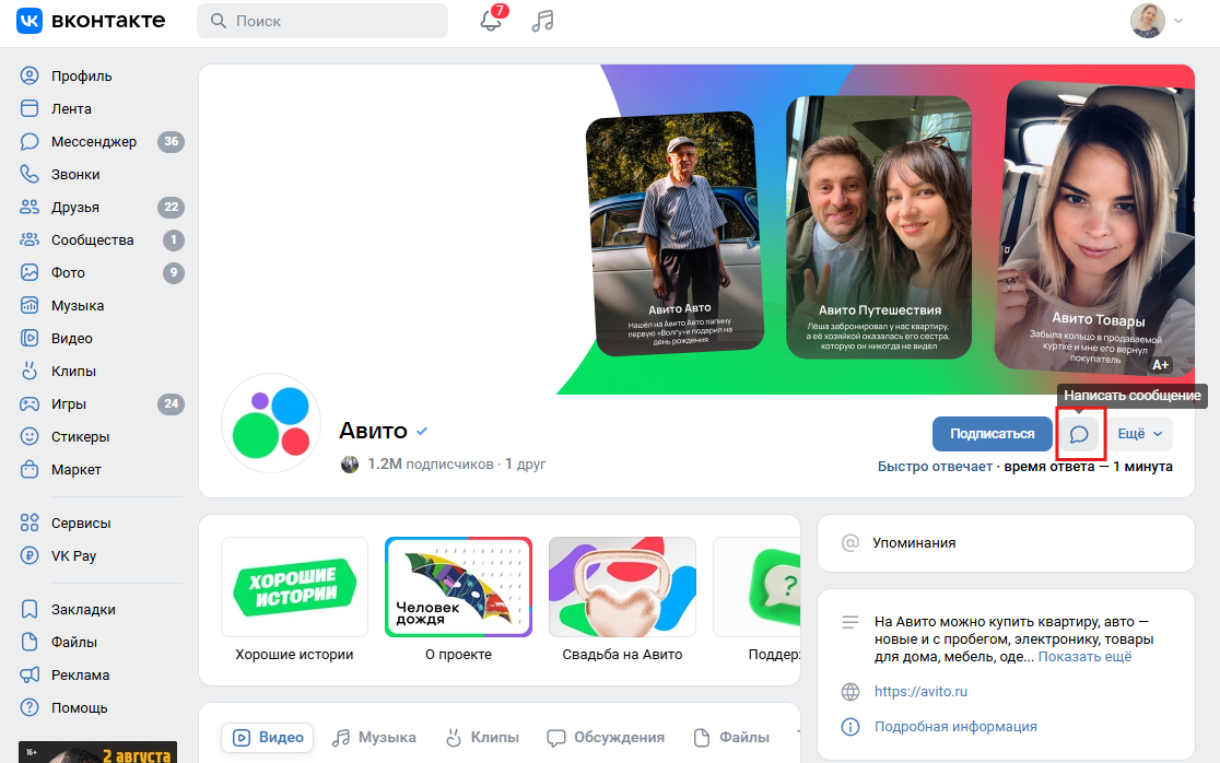 Чтобы написать в группу поддержки Авито ВКонтакте: